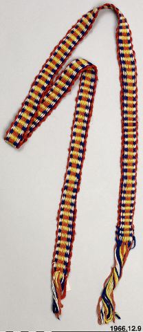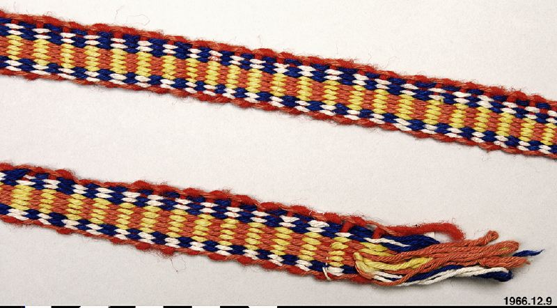 Vävt band, varp av bomullsgarn i flera färger, inslag i acryl el. liknande. I bägge sidorna vänder varptråden och ligger som en oknuten frans som ej är uppklippt. Ingen katalog finns till 1966.12.... men föremålet är införskaffat av G. Moberg, förmodligen från Nordafrika.