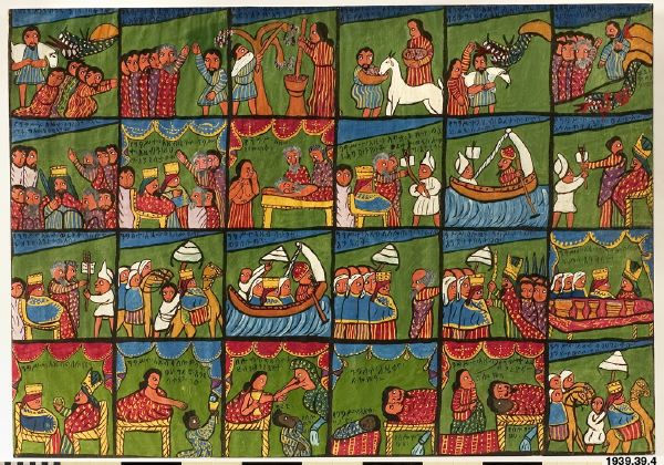 Målning. Handlar om drottningen av Saba och Salomo. Duken indelad i 24 kvadratiska småbilder Rutan överst t.v.: Tillbedjan at ormen eller draken. Nästa ruta: Drottningens av Saba fader kommer överens med folket att döda draken. 3., rutan: Gift blandas ihop i en trämortel och ges åt en vit killing (4: rutan): Killingen ges sedan åt draken (5: rutan).. 6: rutan: Drottningens far dödar draken och beder (?) för folket; 4. rutan i 2.. raden: Drottningen av Saba får brev från Salomo. OBS. hår brevet bäres upptill i en klåven.käpp, det i'Afrikai'åtminatone österut; vanliga sättet att sända brev med budbärare .Rutorna 5 6 i andra raden: Visa förmodligen hur_ budbärarenåtervänder över Röda havet och framför svaret till Salomo. Rad 3,. ruta 1: Drottningen av Saba får förmodligen svar från Salomo, att hon är välkommen. Övriga rutor i denna rad visa hennes färd och hur hon välkomnas av Salm°. Nedersta raden: Drottningen av Saba, Salomo och den svarta tjänarinnan enligt legenden samt drottningens avresa från Salomo. 86 x 121 cm. Abessinien Den gamla dynastien i Shoa ansågs härstamma från Menelik, son av drottningen av Saba och Salomo. Litt.: Jensen, anf. arb., Taf. 2 återger en tavla över detta motiv: "Sage vom Drachen Wainab und von der Königin von Saba"(Ursprång der Salomonischen Dynastie). Inhalt der Sagen se S. 5 ff. Målning, jaktscen: Jägare och elefant, som tram, par på en annan jägare. Jägaren är ingen känd person.•I texten synes stå något om att "han var en duktig man, fastän han endast hade kor, ta byxor". 86 x 120 cm. [ocr]