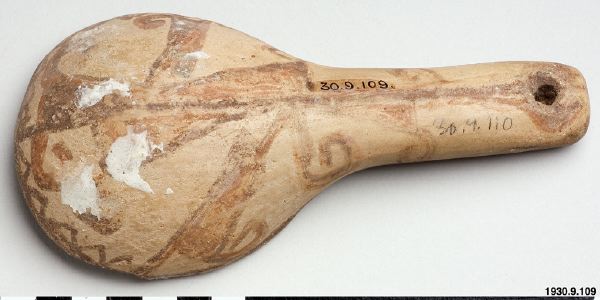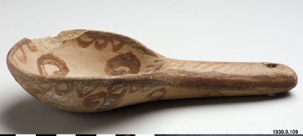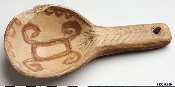 Polychrome ladle. Hopi? Polacca polychrome. 1880-1930. Child´s work aimed for sale? Enligt Kelley Hays-Gilpin forskarbesök 2009.