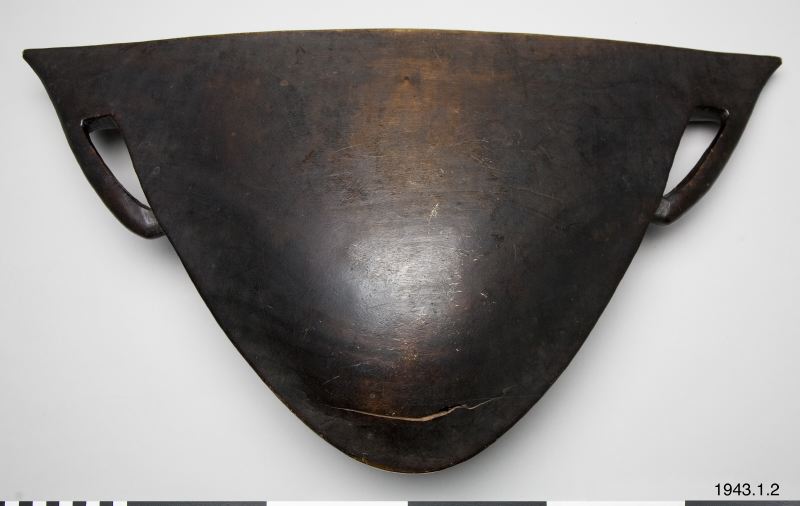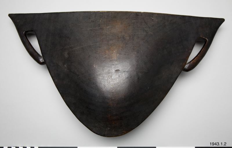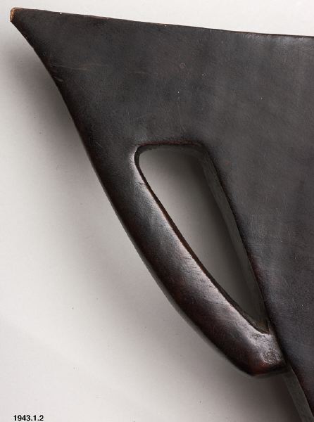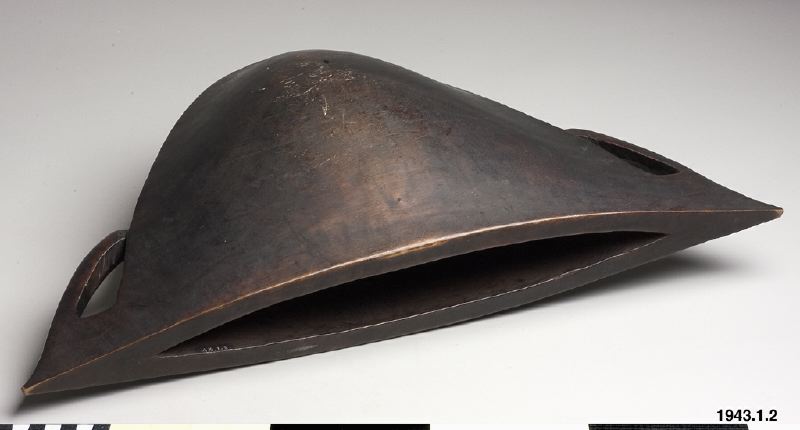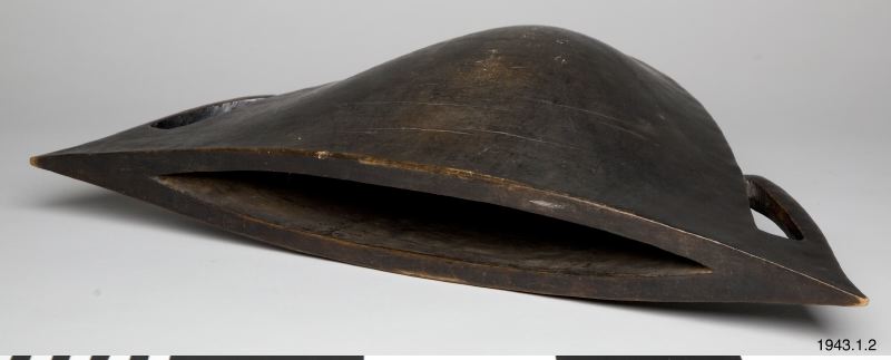Sprundtrumma (kallad n´guia i Svinhufvuds anteckningar). Platt smal, av mörkt trä med rundad botten, två utskurna handtag och smal oval öppnng upptill. I "Die afrikanischen Musikintrumente" sammanför Ankerman denna typ med "klockor utan kläpp". den bör också snarare kallas för en gong än en trumma. Användes vid trumtelegrafering? (enl. generalkatalogen) /KB
