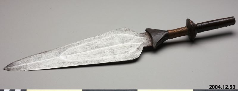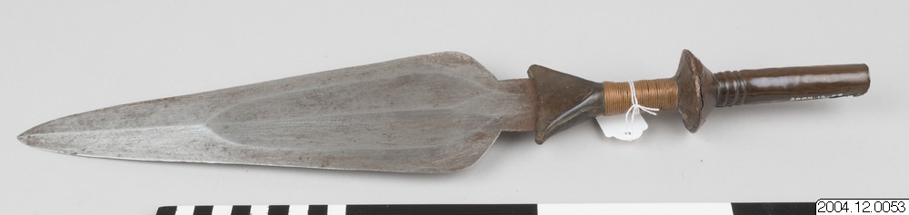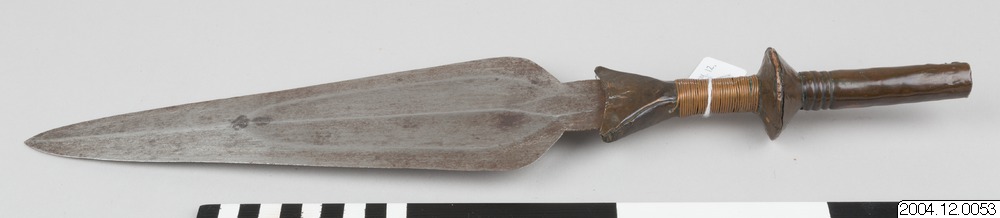 Spjutspets med koppardekor. Denna samling, 2004.12., är speciell därför att föremålen härrörs från östra Kongo, bl.a. från pygméfolk, vilket är sällsynt.