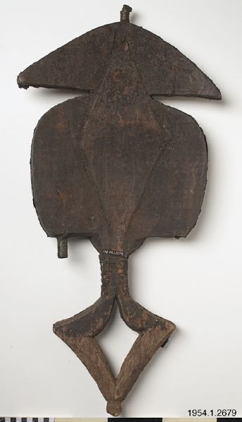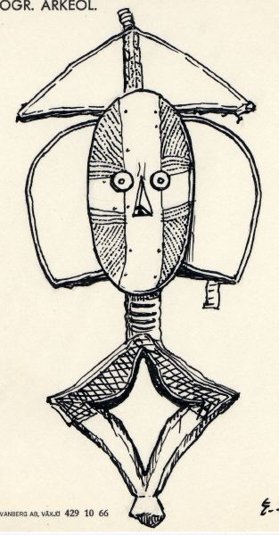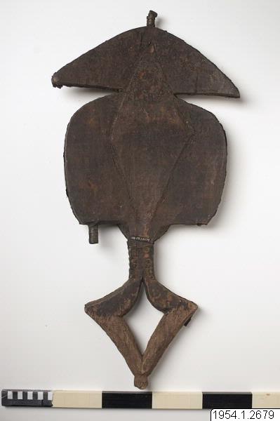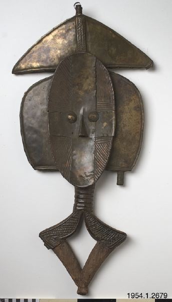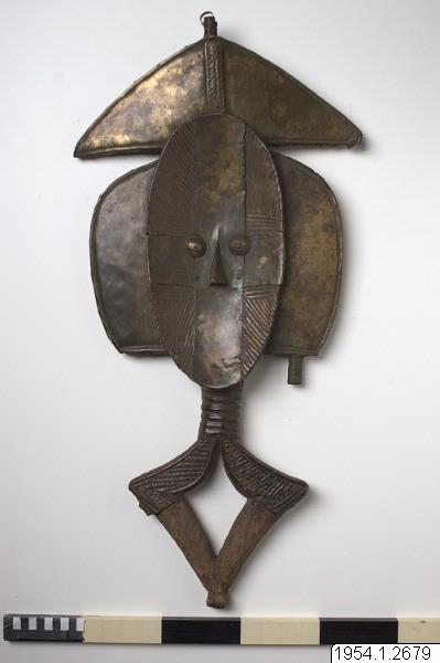 • En träkropp inklädd i mässings- och kopparplåtar. Hela föremålet täljt i ett trästycke. Upptill en metallklädd trekant, som en hatt, med en spets pekande uppåt, av trä. Under ett ovalt konkavt ansikte. Utstående ögon och näsa. Ansiktet klätt i ett kryss av släta mässingsplåtar och runt om ligger räfflade kopparplåtar. Från ansiktet åt varsin sida stora utstående metallklädda träblock, tappar likt ... Visa hela