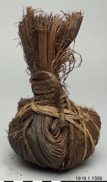 • Ett nkisiknyte i rödbrun växtfiberväv, troligtvis raffia. Påsen är ihopknuten med hjälp av flätat snöre av växtfiber. Ingen öppning finns för att se vad påsen innehåller.