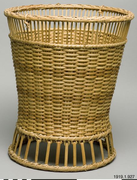 En korg, lite större än en "normal" papperskorg. Tätt flätad centralt men ca 6-7 cm från ovankanten och ner samt från nederkanten och upp mycket glesare flätad. Rejäl och stadig korg.