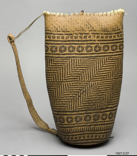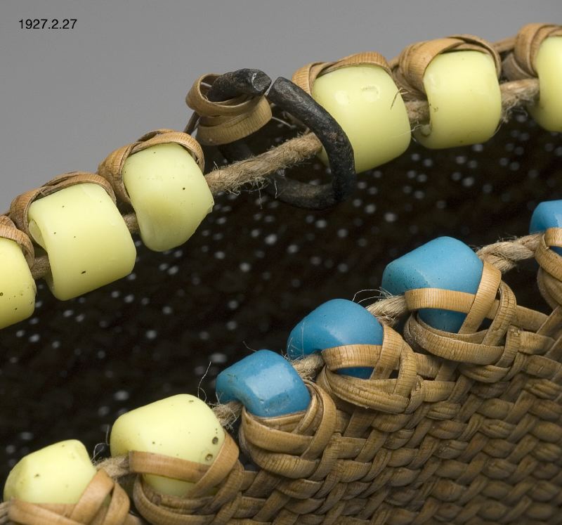 Öglorna vid mynningen utgöras av flera cylindriska ljusgula och 4 ljusblå aggripärlor. Ornamentik: i det breda mittfältet fiskfjällmönster, å de 3 bårderna månar, fiskfjäll (i mitten nedtill) och hundspår (nederst, resp. överst på korgen). Längd: 35 cm. Bredd: 13 cm. [ocr]