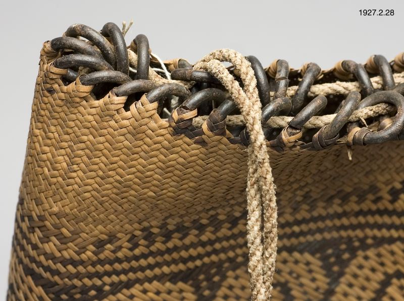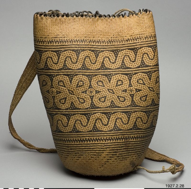Öglorna utgöras av järnringar. Ornamentik (se fig.): det bredaste fältet frukter, de breda fälten å ömse sidor grytkrokar (a), de smala fälten fiskfjällmönster (b). Höjd: 37 cm. Bredd: 15 cm. [ocr]
