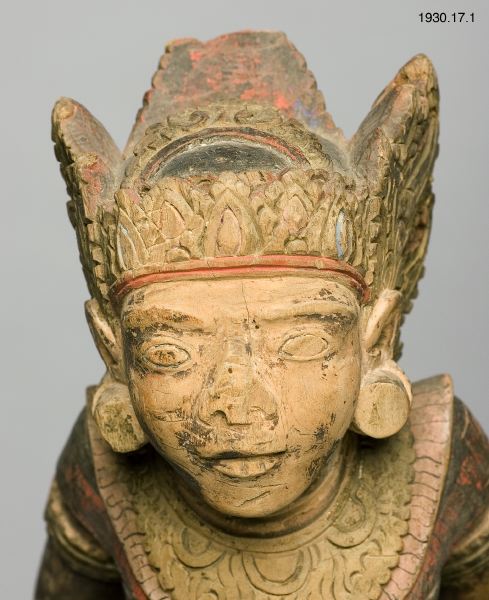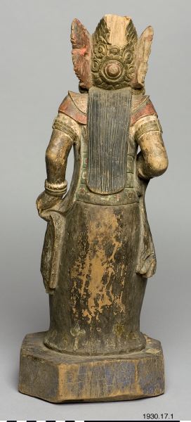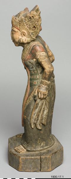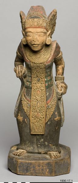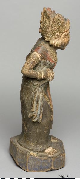 • ("tempelskulptur") föreställande risets gudinna, Dewa Sri. Hon är iförd en fotsid klädnad som dock endast delvis döljer de nakna fötterna» Vidare bär hon ett blusliknande plagg, från vilket nedhänger sjalliknande stycken (under armarna), vilka hon håller upplyftade med händerna: En dubbelkrage täcker axlarna och fortsättes framtill med ett långti •smalt rektangulärt tygstycke, som sträcker sig ned... Visa hela