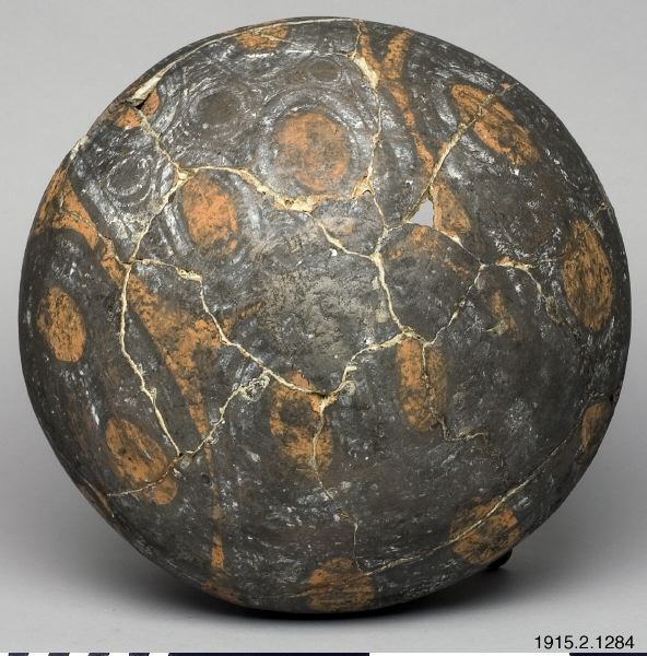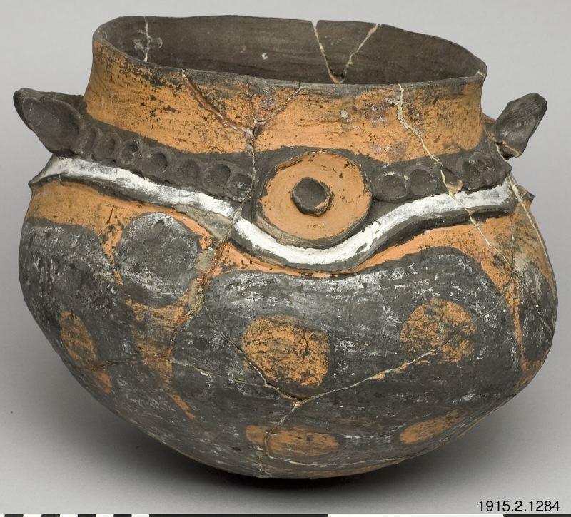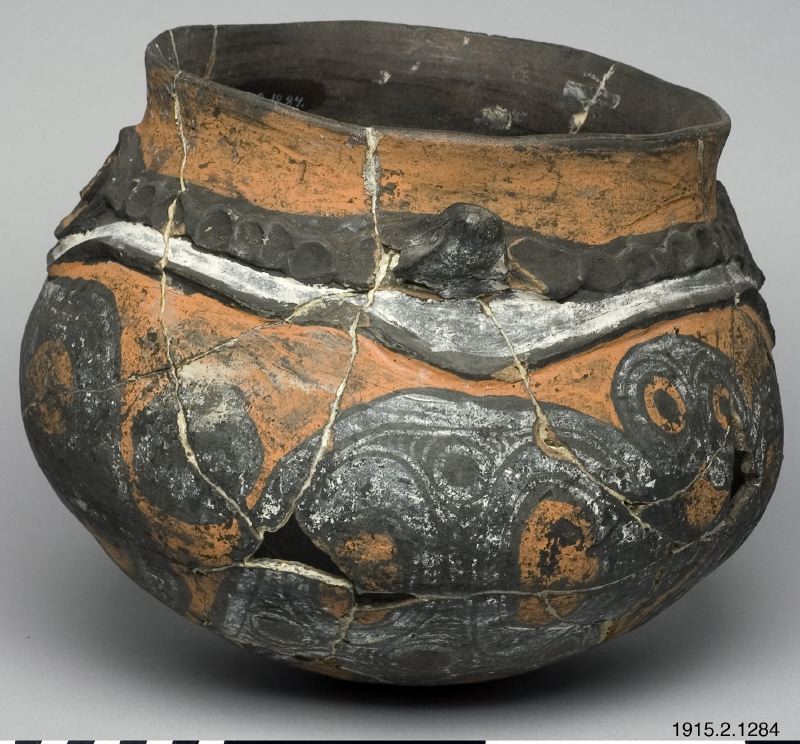 Stor kruka av keramik, uppbyggd genom att lerstrimlor lagts på varandra och tryckts ihop. Leran är fattigt magrad med sand, och har av färgen att döma bränts vid låg temperatur på öppen eld. Poröst. Krukan har en konvex botten. Krukan har en skuldra, med en markerad vinkel mot halsen. Dekorerad med applique av lera, bestående av två grepp och pålagda ringar av lera och en våglinje en sk. Schlangerormen. Krukan är polykromt målad efter bränning, med anthropomorfa/zoomorpha figurer som påminner lite om bläckfiskar i vitt och svart mot röd bakgrund.Vid skuldran dekorerad med ett målat band i rött och svart och vid mynningen målad med röda triangelformade figurer med svart kant. Krukan har gått sönder och lagats med klister.