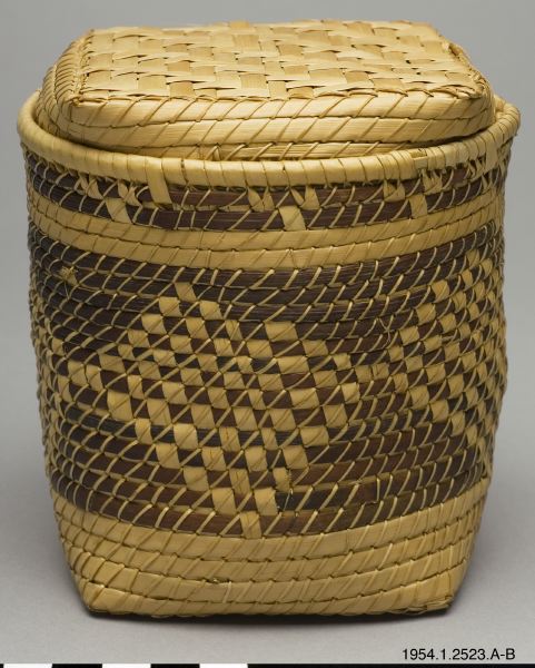 • Korg, cylinderformad med fyra hörn i botten. Mönstrad utmed korgen i ljusa och mörka inslag, vilka bildar ett rutmönster. Lock, med fyra hörn och liten kant, trycks ner i korgen.