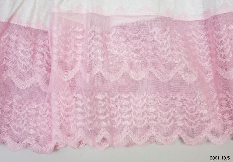 • Vit underkjol, rynkad mot ett smalt midjeband av nylon. Nedtill avslutad med en 16 cm bred, cerisrosa maskinspets. /EM 2006-11-22