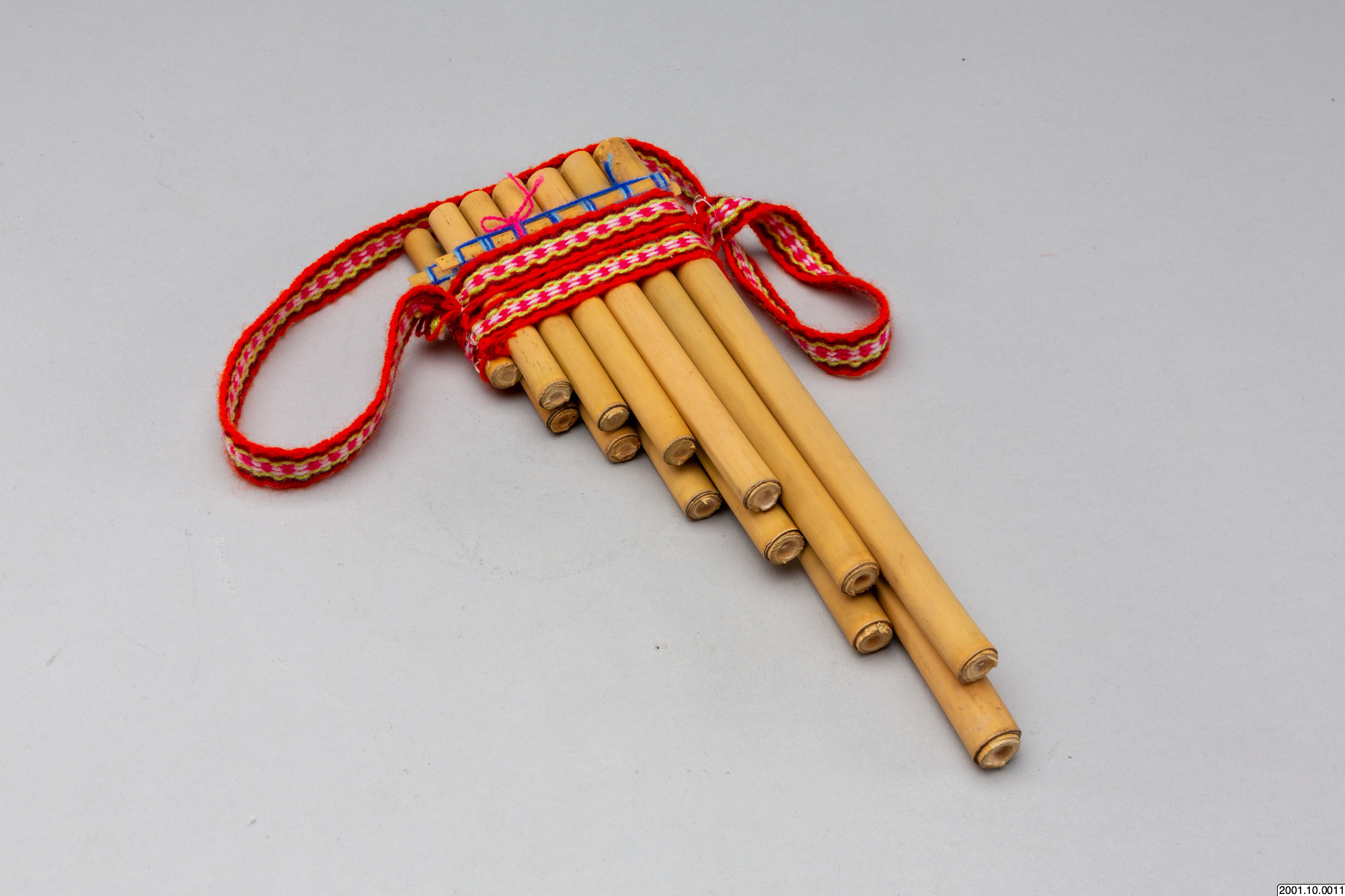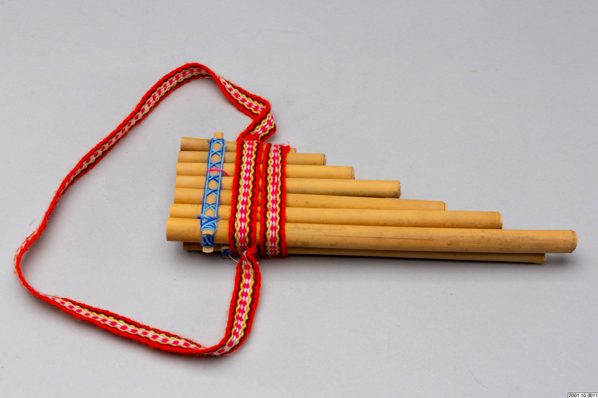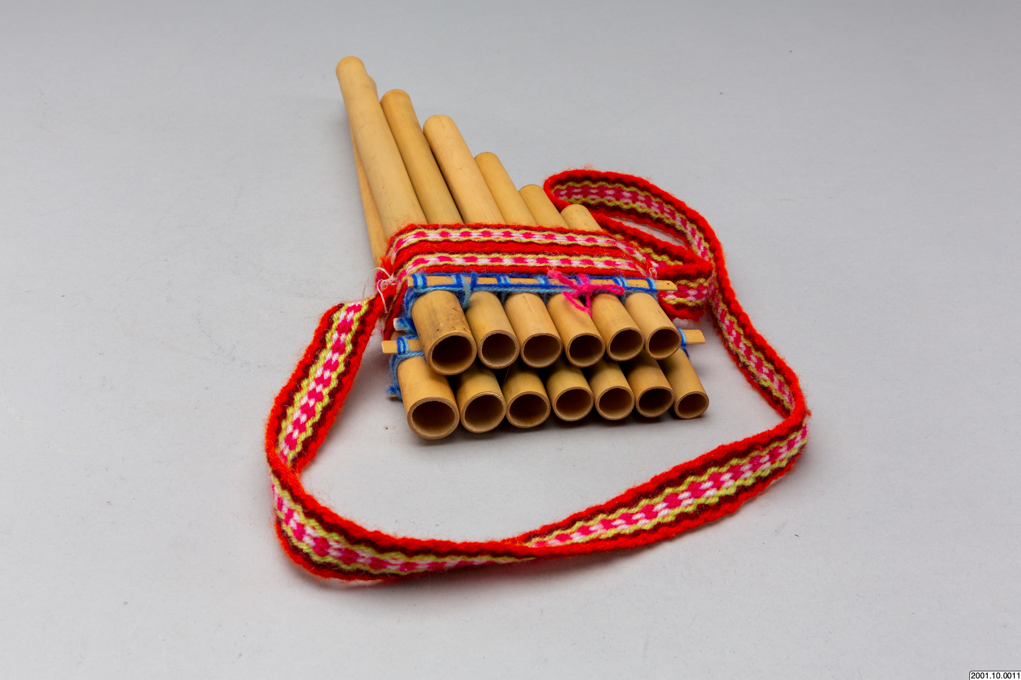 Flöjten består av vassrör i fallande längd sammanfogade i två lager med sex respektive sju rör. Över rören, på båda sidor av flöjten, sitter tunna stickor av vass lindade med blått garn som håller samman rörlagren. Runt flöjten sitter också ett vävt band i rött och vitt syntetgarn. /EM 2006-11-22