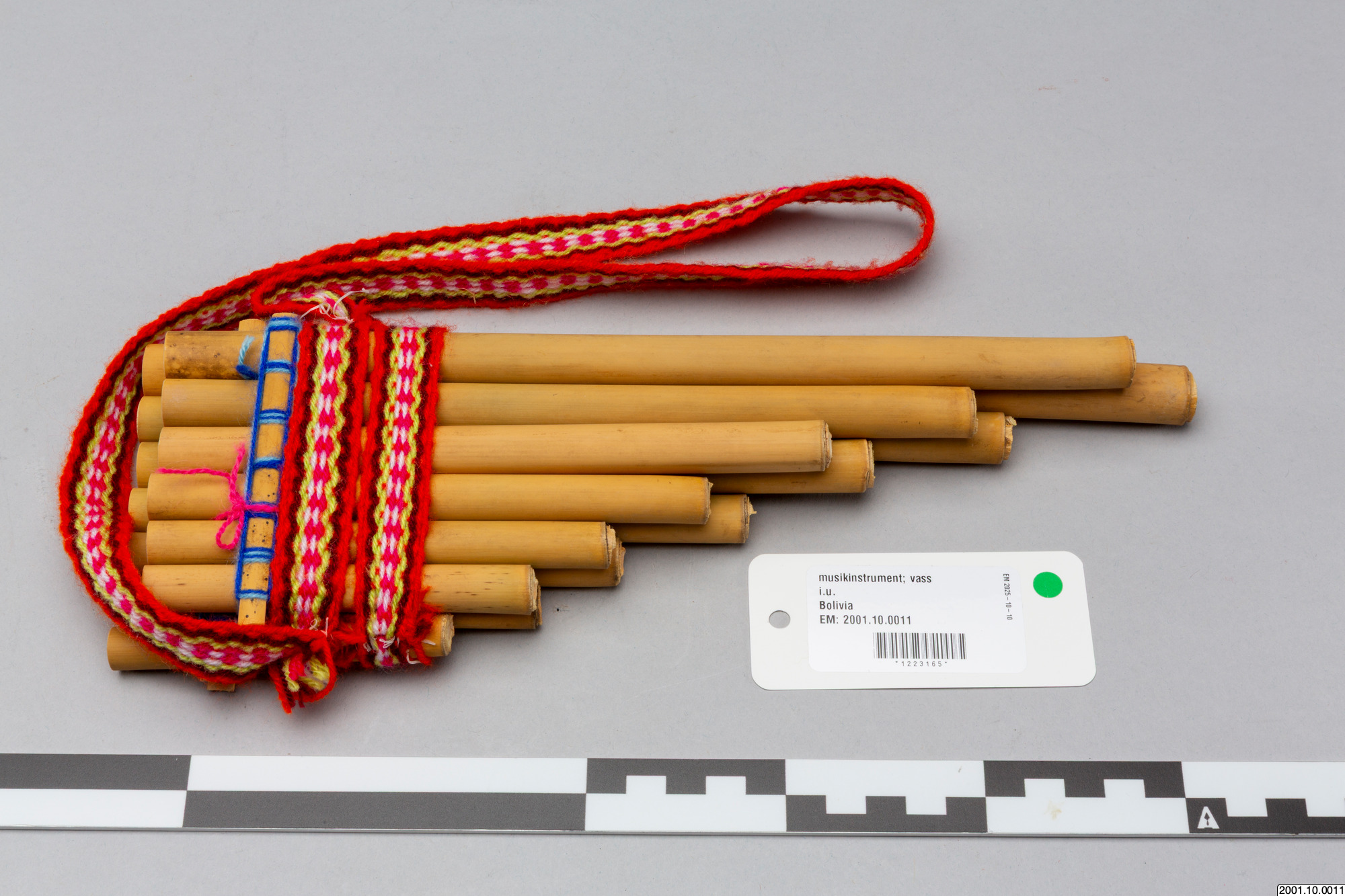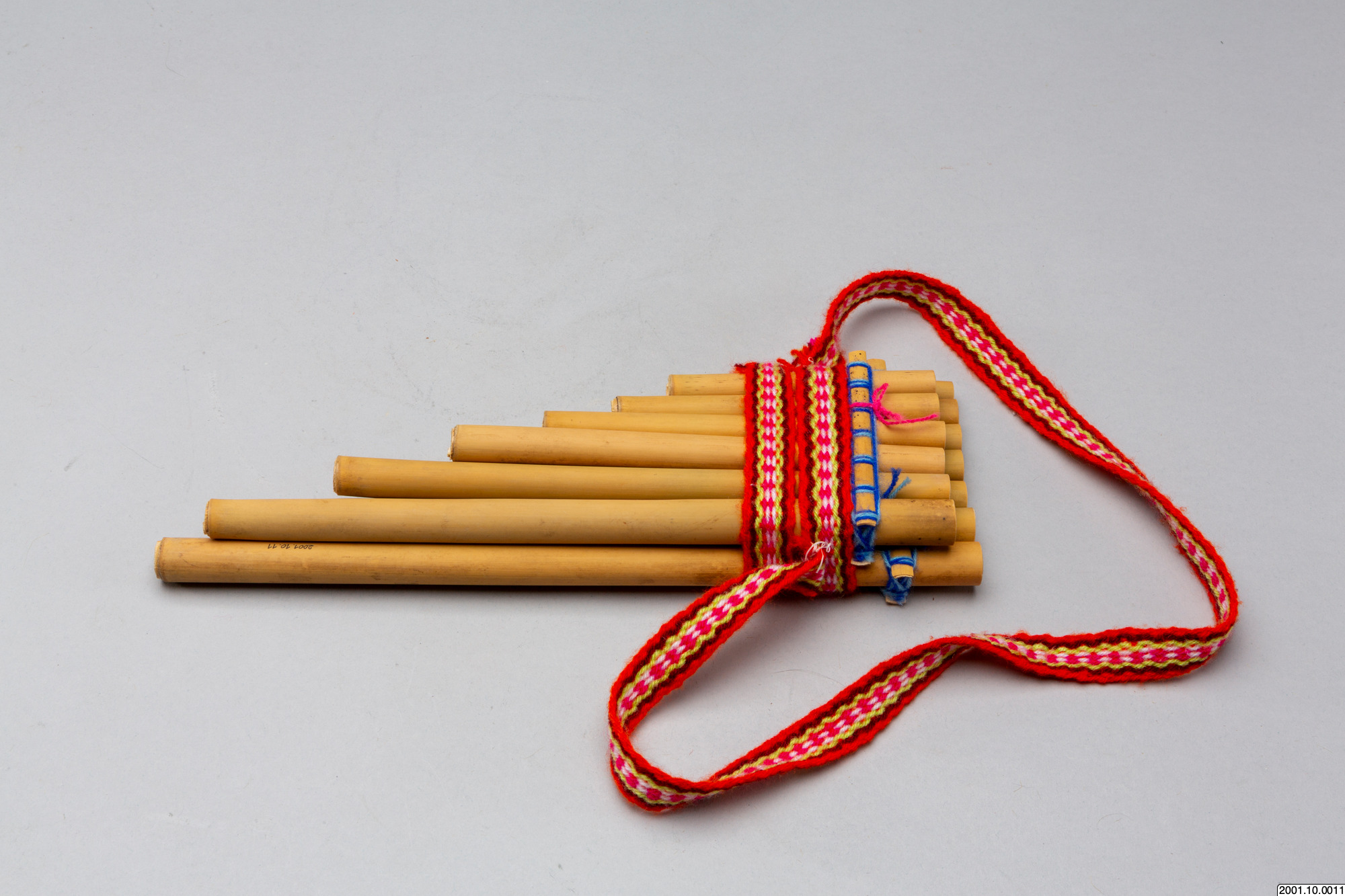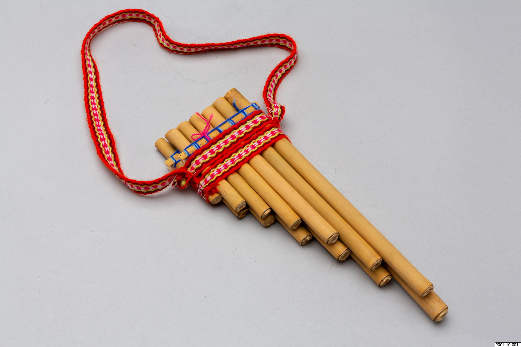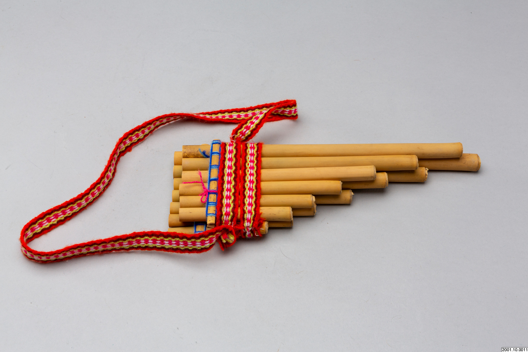 Flöjten består av vassrör i fallande längd sammanfogade i två lager med sex respektive sju rör. Över rören, på båda sidor av flöjten, sitter tunna stickor av vass lindade med blått garn som håller samman rörlagren. Runt flöjten sitter också ett vävt band i rött och vitt syntetgarn. /EM 2006-11-22