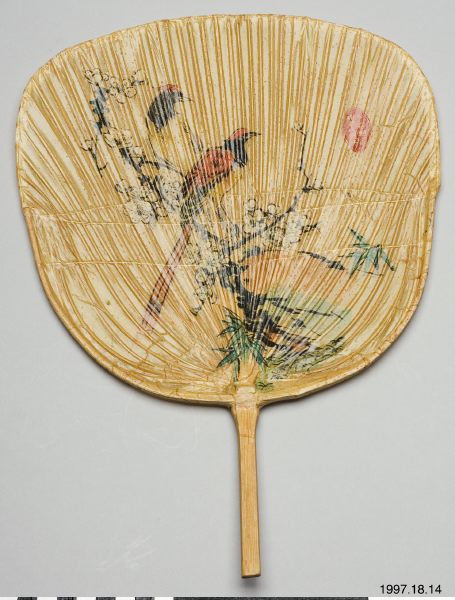 • Solfjäder av papper, trähandtag. På framsidan två fåglar som sitter på en blommande kvist.