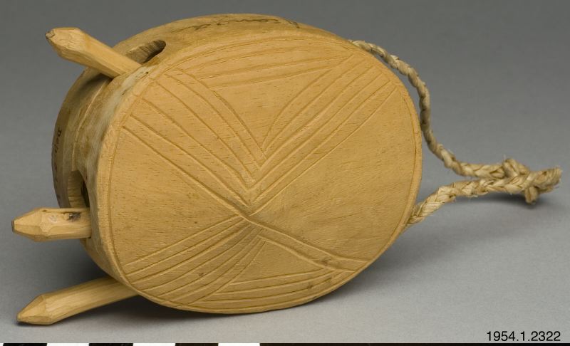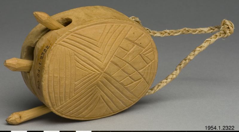 • En i ljust trä utskuren klocka. I den ihåliga träbiten är tre kläppar fastsatta. På plattsidorna utskuret mönster. Ett snöre för upphängning.