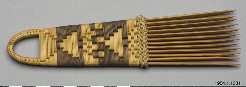 • Kam av palmribbor och växtfiber. De växtfibertrådar, natur- och svartfärgade, som använts för att konstruera skaftet och hålla ihop träpinnarna har knutits och tvinnats på ett sätt så att dekorativt mönster framträtt.