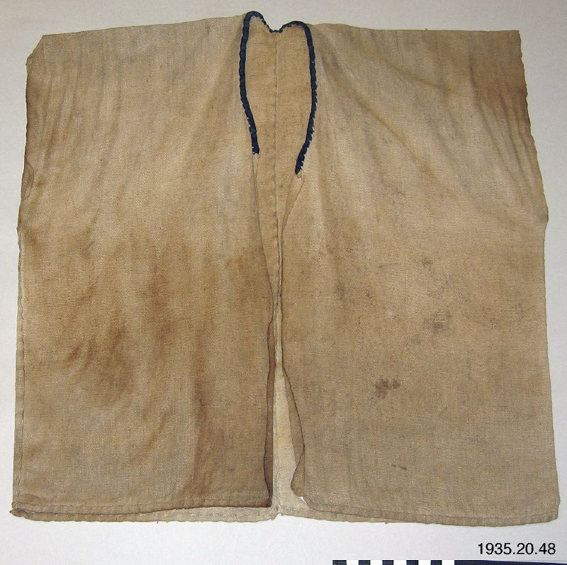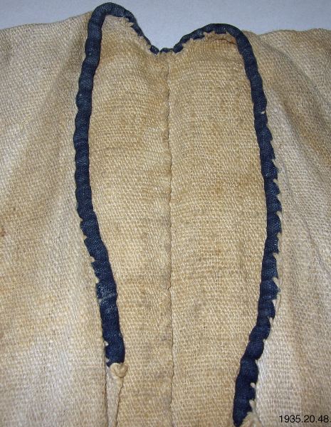 Väst av grovt bomullstyg. Två våder hopsydda på mitt bak samt i sidorna. Öppen fram och något ringad hals som kantats med ett mörkblått bomullsband. Västen är mycket missfärgad och smutsig.