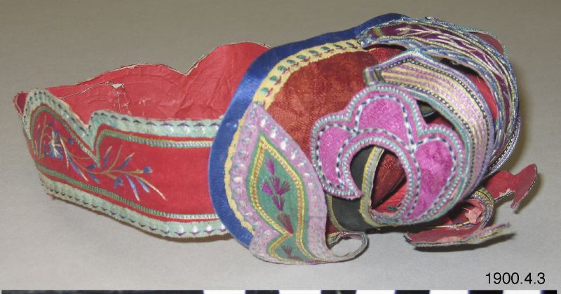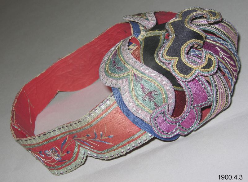 • I katalogen står föremålet inskrivet som ¿tigermössa för barn¿. Skira broderier på tyg, monterat på styv papp. En rundel med höjd på 4 cm, framtill dekorerad med samma typ av material. Textil i olika ... Visa hela