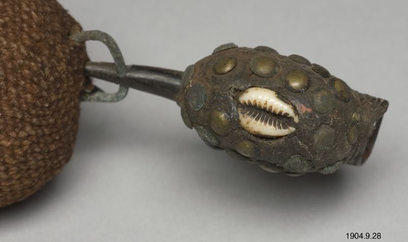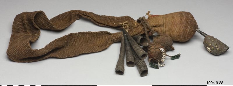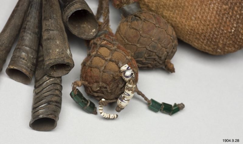Fetisch av grovt vävt tygband i rödbrun färg vilken avslutas med en med något fylld påse gjord i samma material. På bandet hänger flera svarta antilophorn, gröna glaspärlor och vitgrå pärlor kaurisnäka på harts, textilbollar, möbelspik etc.