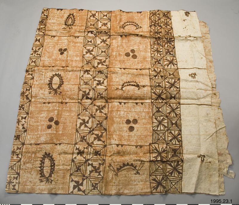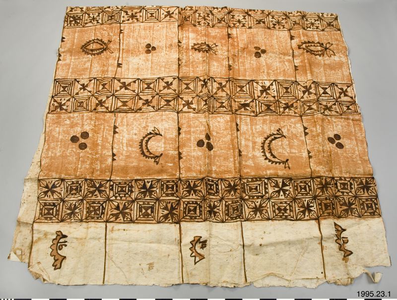 Rektangulärt barktyg eller ngatu av utbultad innerbark, hopbultat av flera lager och skarvat av flera våder. Tillverkad och mönstrad med på Tonga vanligt sätt; Varje våd (var och en av flera lager barktyg) mönstras liggande över en bänk med mönsterplattor med relief inunder, och hoplimmas efterhand med nästkommande bård. Bottenmönstret i brunrött (från koka träd) gnids in men sidofälten lämnas of...