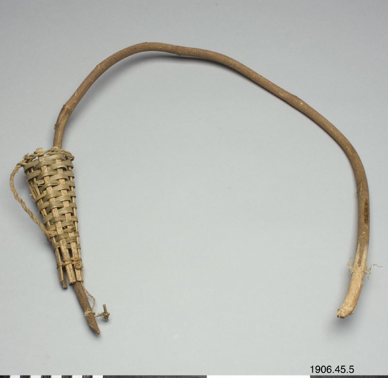 • En böjd träpinnen med en liten korg i ena änden.