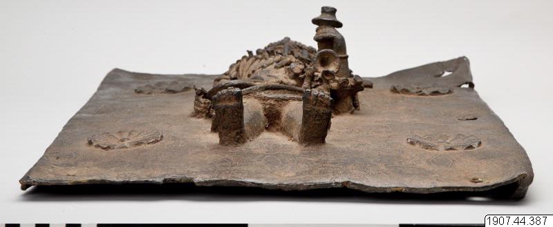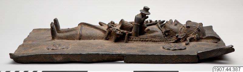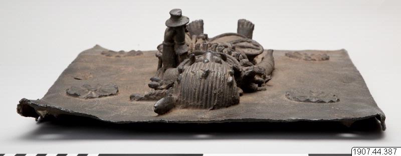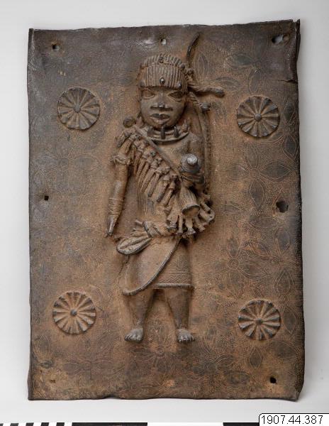 Utställningstext STADEN (kopplat till föremålet): Det kungliga palatset var också platsen för en av de mest fascinerande konstformerna i Benin- rektangulära bronstavlor med avbildningar i relief av personerr och händelser i det ceremoniella livet vid hovet. Omkring 900 sådan relieftavlor finns kvar i världen idag och sägs i det gamla Benin ha hängt uppspikade på de takbärande pelarna i palatset, där de bildade en imponerande fond för de hovceremonier de delvis också avspeglar. Utställningstext STADEN 1998, Benin City: "DÄR KUNGEN AV NÅD RÅDER ÖVER LIV OCH DÖD" Kungariket Benin ligger i den tropiska regnskogen i södra Nigeria. Majoriteten av dess befolkning är kända som edo, men också grupper av ibo, ijaw, yoruba och itsekiri bor inom rikets gränser. Kungarikets hjärta är dess huvudstad, som förr hette Edo men idag kallas Benin City. Utanför huvudstaden lever det jordbrukande folket i flera hundra byar under sina äldstes ledarskap. Benins kulrurrikedomar blev kända för västvärlden 1897 genom brittisk straffexpedition riktad mot Benin City, då tusentals konstverk från det kungliga palatset beslagtogs och senare spreds till museer och privatsamlingar över hela världen. Det är en kunglig konst som skapats för att förhärliga den gudomlige kungen, Oba, och hans föregångare. Också idag sitter en gudomlig kung, Oba Erediauwa, på tronen i Benin och styr över ett hängivet hov, över storslagna palatsritualer och över livaktiga konstnärsskrån. Detta sammantaget gör Benin City till ett religiöst och rituellt centrum och i kraft av kungamakten till en stad av gudomlig inspiration. "HÖGSÄTET FÖR OBA - HIMLENS UTVALDE" Benin City, i dagens Nigeria hem för omkring 200 000 människor, har alltid varit kungariket Benins administrativa och religiösa centrum, något som också avspeglar sig i dess uppbyggnad. Stadens kärna omges av en dikerad lerjordsmur som enligt traditionen skall ha anlagts av den sittande Oban vid mitten av 1400-talet. Området inom denna ringmur delas i två sektioner av en bred gata, där den mindre sektionen i sydväst inrymmer kungliga palatset och de olika palatssällskapens och palatschefernas hem, medan den större sektionen nordöst om skiljegatan bebos av stadscheferna och alla yrkesspecialister som arbetar för kungen, såsom de olika konstnärsskråna. Bortom denna inre mur sträcker sig en yttre mur, som inringar det område där kungens många rituella funktionärer bor. Inom den yttre muren ligger också de byar som styrs av Uzama, de mest uppburna hövdingarna i Benin med ansvar för de ritualer som skall trygga hela rikets välbefinnande. Just utanför den yttre muren ligger sedan drottningmoderns och tronföljarens båda palats. Så åskådliggör stadens själva planläggnning den gudomlige kungens centrala position, liksom motsatsförhållandet mellan palatschefer och stadschefer och Uzamas speciella ställning. Det kungliga palatset, en vidsträckt anhopning av byggnader och gårdar, är rikets och stadens hjärtpunkt, varifrån den andliga kraft emanerar som är så avgörande för hela rikets hälsa och välgång. Där i centrum av centrum förvaras också de kungliga förfadersaltarna med sina bronshuvuden, utsirade elefanbetar, klockor och andra föremål, som alla har en roll att spela i tillbedjan av de kungliga förfäderna och den jord i vilken de är begravda.