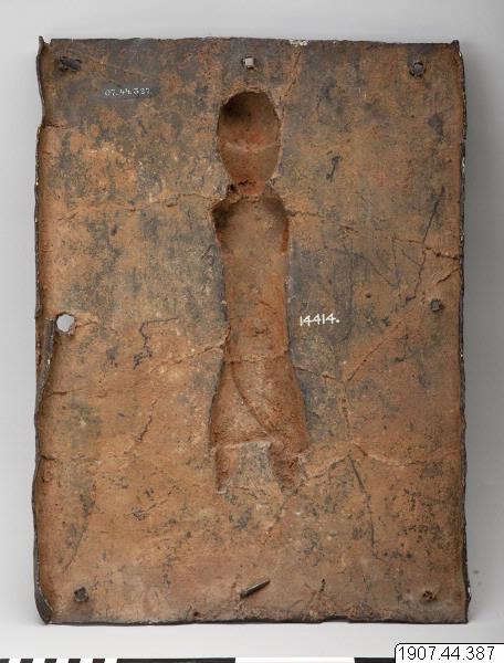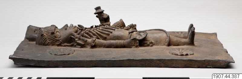 Utställningstext STADEN (kopplat till föremålet): Det kungliga palatset var också platsen för en av de mest fascinerande konstformerna i Benin- rektangulära bronstavlor med avbildningar i relief av p...
