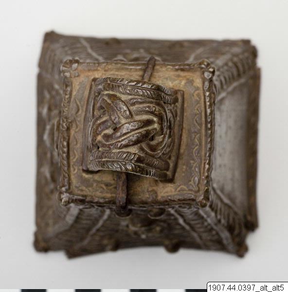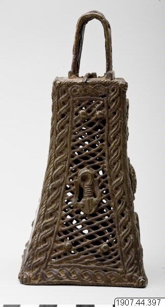 • (9922) av brons, ornerad. Höjd: 17 cm. Bredd: 8.2 cm. Benin [ocr]