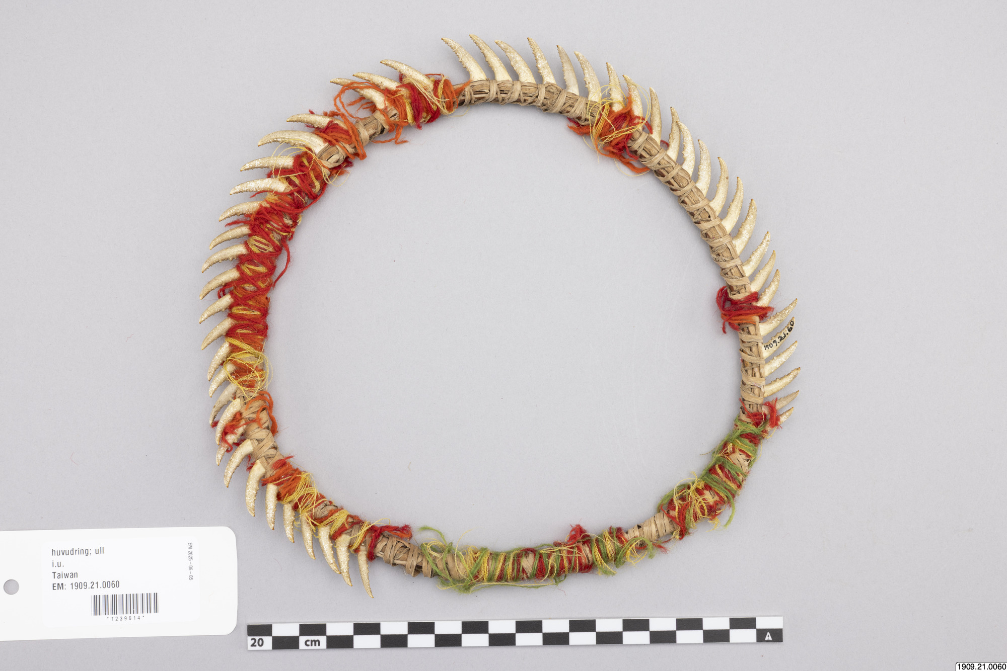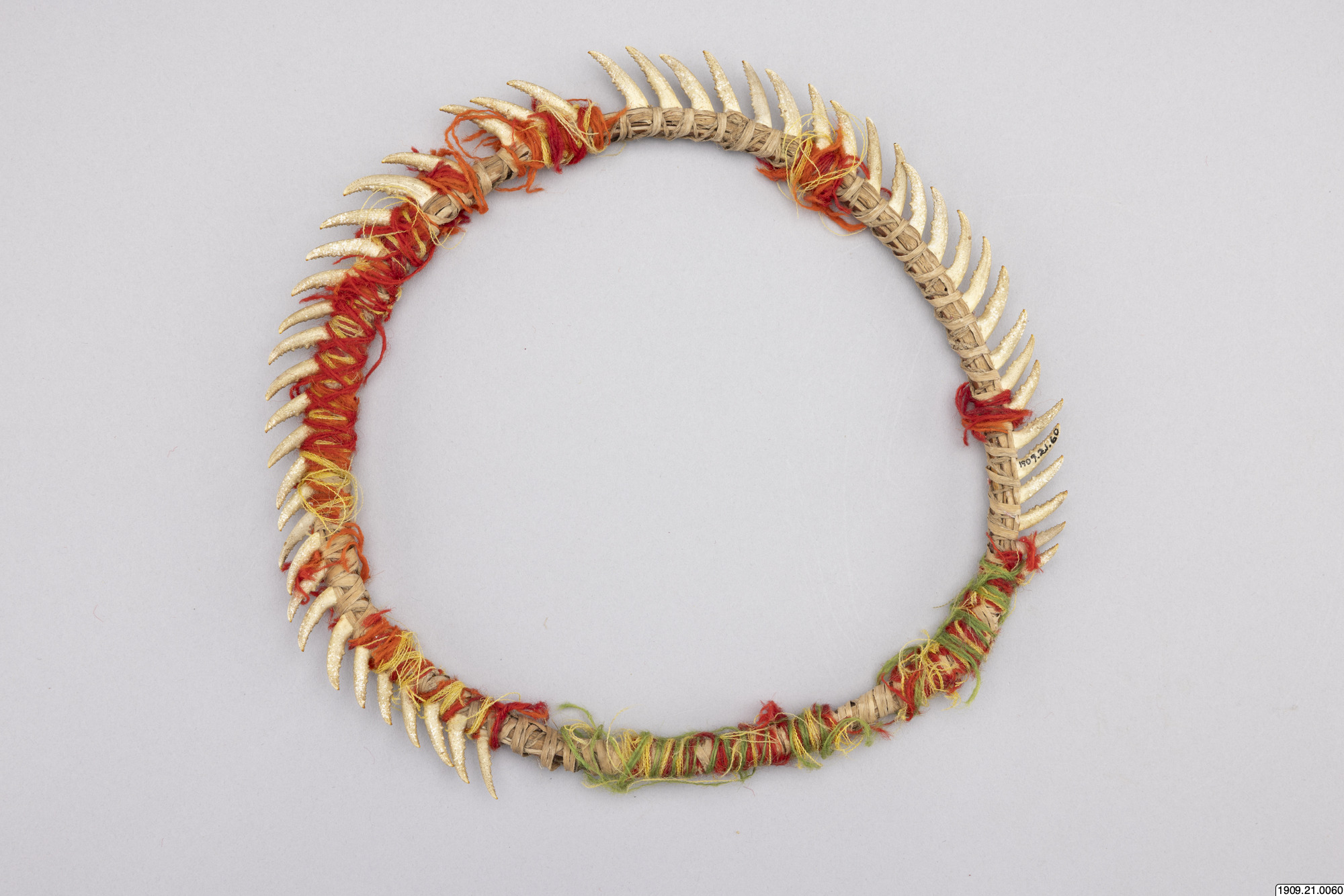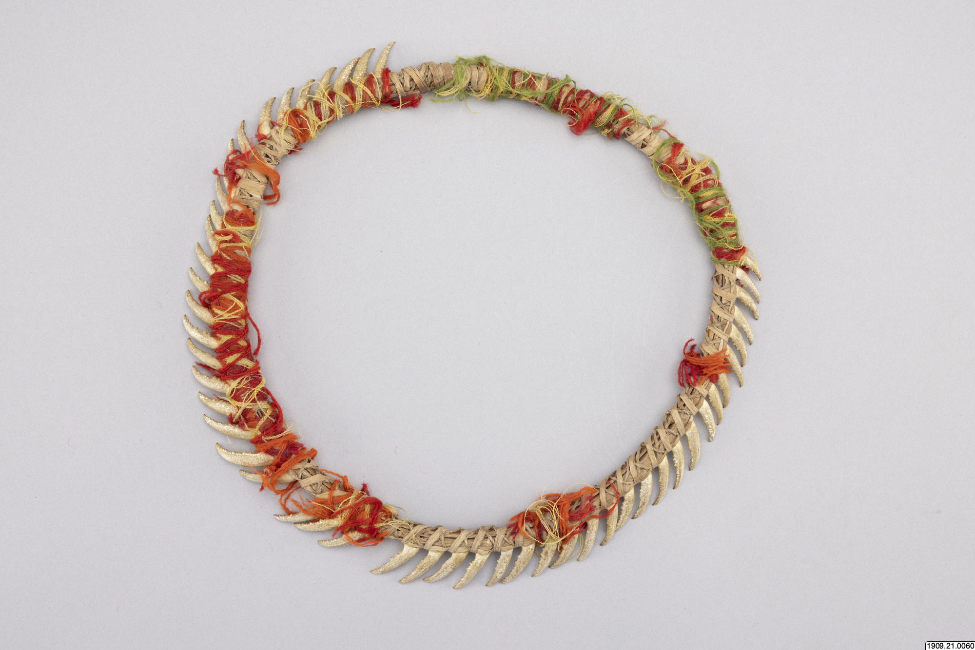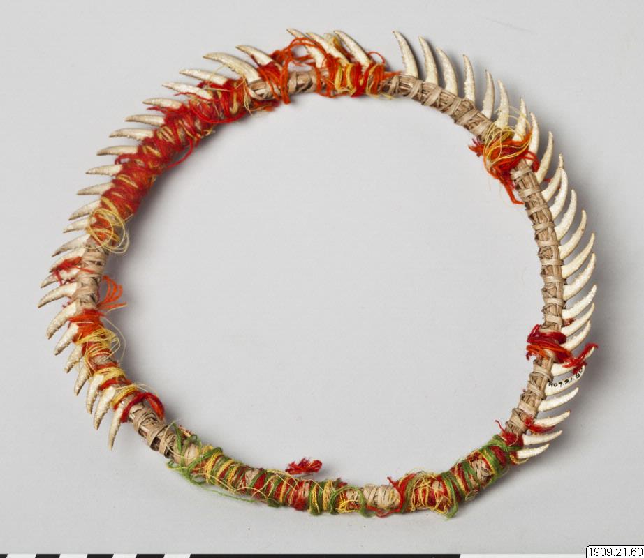 • Huvudring. Kräftklor är fästade med gula och röda ulltrådar vid en ring av halm. Chacharabin Camno, Kuruchi Paiwagruppen (genralkatalogen)
