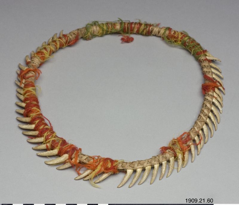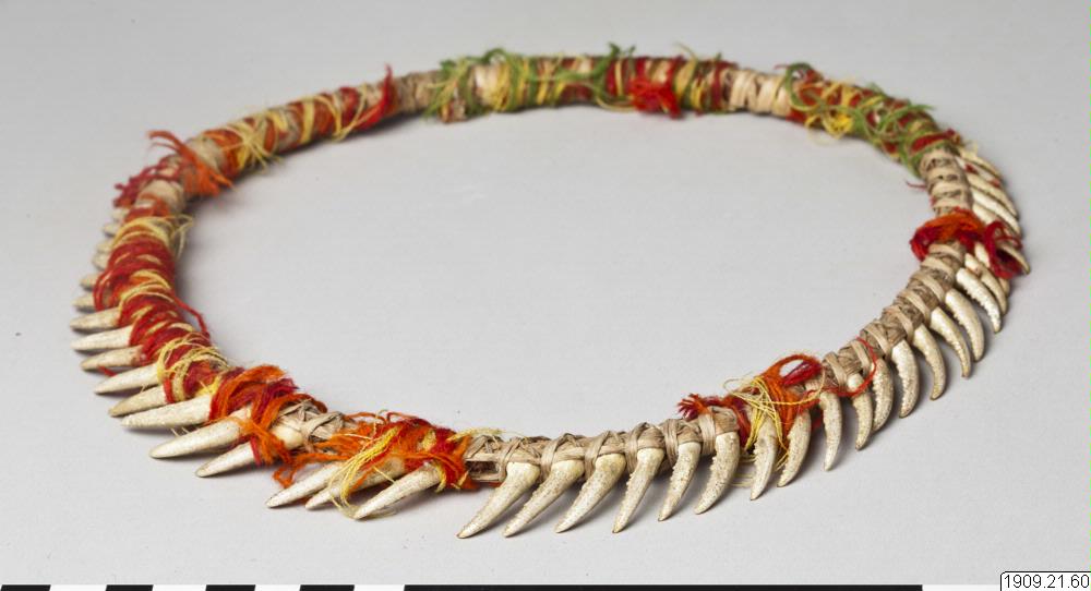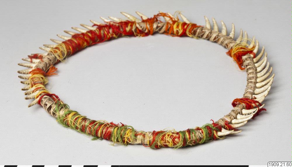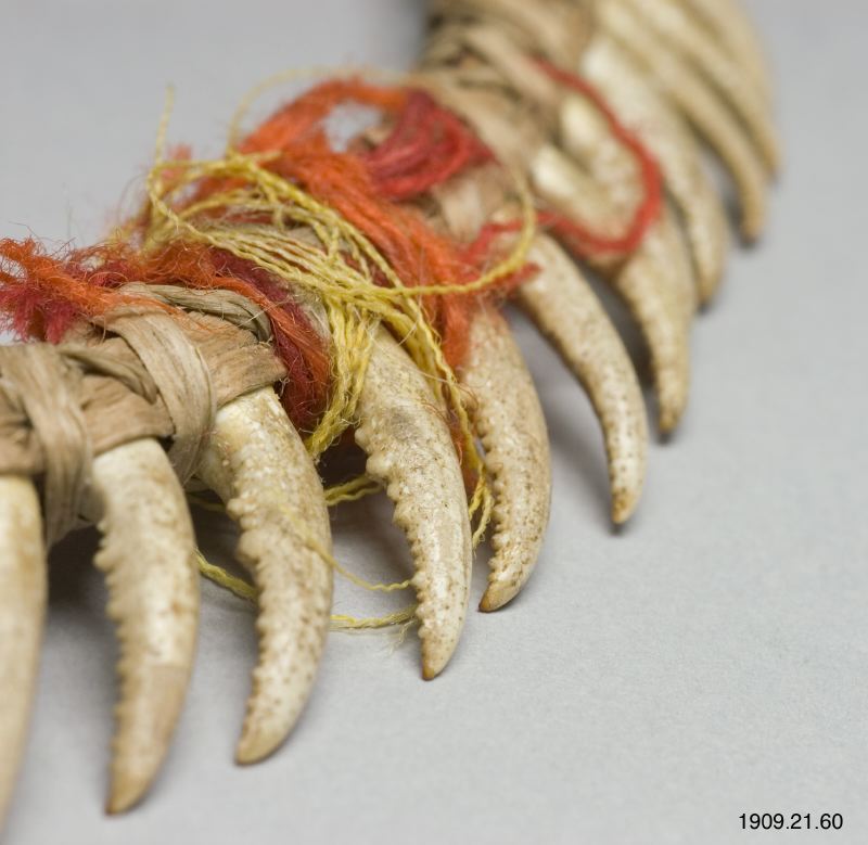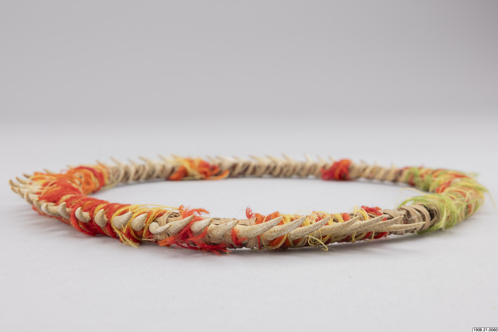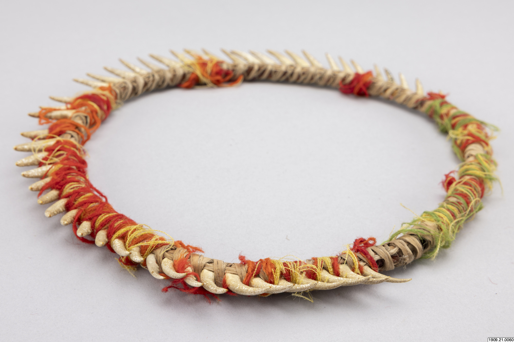 • Huvudring. Kräftklor är fästade med gula och röda ulltrådar vid en ring av halm. Chacharabin Camno, Kuruchi Paiwagruppen (genralkatalogen)