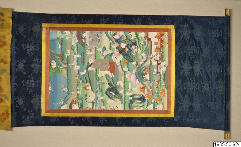 De tibetanska rullmålningar (thanka) som bär accessionsnumren 1935.50.0811 till 1935.50.0829 utgör en serie om 19 thankas föreställande den tibetanske yogin och poeten Jetsun Milarepas (Rje-btsun Mi-la-ras-pa) liv, från födelse till död (1052-1135). Den förvärvades den 14 februari 1930 i Peking av Gösta Montell för Sven Hedin under den senares sista stora expedition (1927-35). Serien, som uppgavs komma från ett av templen i Qingdynastins sommarhuvudstad Jehol/Chengde, kostade 36 Mexikanska Dollar att förvärva. Efter inköpet försågs den i Peking med nya textilramar. Milarepas levnadsöde finns nedtecknat av en av hans närmaste lärjungar, Rechungpa ((1083/4-1161), i en biografi, namthar (rNam.thar), som speglar hans liv fyllt av personliga umbäranden vilka leder honom in på vägen mot religiös insikt. Denna uppnår han genom att utnyttja buddhistiska – tantriska - tekniker; meditation, övningar och försakelser. Milarepa utgör en av grundarna för den tibetanska Kagyu (Bka'-brgyud) sekten. Hans biografi finns överförd till den form av tibetanska thankas som utvecklades för att skildra olika betydande personers biografier. I den återges i kronologisk ordning scener ur den aktuella personens liv. På duken läser man dem från vänster nedre hörn till höger övre hörn. Vad man anser vara originalversionen för denna serie finns i Hemis klostret, ett Drukpa Kagyu kloster i Ladakh och målades mot slutet av 1700-talet. Den serien följer Milarepas liv som det framställs i texten Mila Grubum ”Milarepas Etthundratusen sånger”. Den serie som Etnografiska Museet äger, överensstämmer i allt väsenligt, om än ej i alla detaljer eller i stil, med Hemis-versionen. Den målades sannolikt någon gång under 1800-talet och stilmässigt uppvisar den drag av två östtibetanska måleriskolor; gadri och menri. Serien är utomordentligt detaljerad och utförd med häpnadsväckande precision och konstfärdigehet . Landskapsmåleriet, som berg och moln, uppvisar klar kinesisk påverkan. (HWq 2011-08-26) Referenser: Bachhofer, Joss (Herausgeber): Verückte Weisheit Leben und Lehre Milarepas Edition Shangrila Haldenwang 1986 Chang, Garma C.C. (translated and annotated by): The Hundred Thousand Songs of Milarepa Vols. I-II The Oriental Studies Foundation/University Books New York 1962 Rhie, Marylin M. and Robert A.F. Thurman: Wisdom and Compassion The Sacred Art of Tibet Asian Art Museum of San Francisco and Tibet House & Harry N. Abrams, Inc., Publishers New York 1991 (pp. 242-5, 368-9) Schmid, Toni: The Cotton-Clad Mila The Tibetan Poet-Saints Life in Pictures Reports from the Scientific Expedition to the North-Western Provinces of China under the Leadership of Dt. Sven Hedin Publication 36 Stockholm 1952