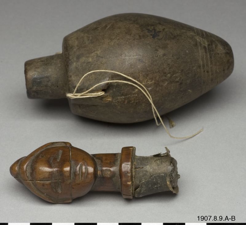 • Locket till kruthorn. Snidat med form av trähuvud. Blankt träslag, ser ut att vara lackat.