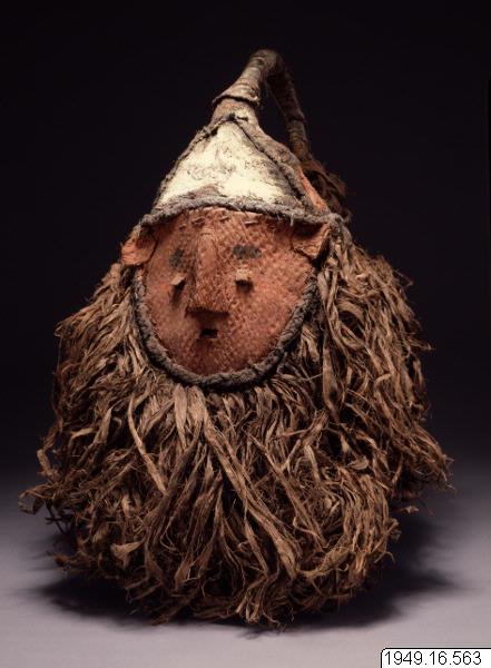• Enligt generalkatalogen: Mask (som nr 563, men med mera färg och yvigare skepparkrans) av barktyg och bast, rött människoansikte, ögonspringor, färgad näsa och öronlappar, svart hjässkelett med rött och vitt påmålat, med svart böjd tofs, mörk "skepparkrans" av bast.
