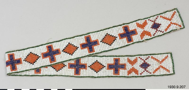 • Pärlstickning. Troligen pannband. Vita, röda, gröna och blåa pärlor. /generalkatalogen