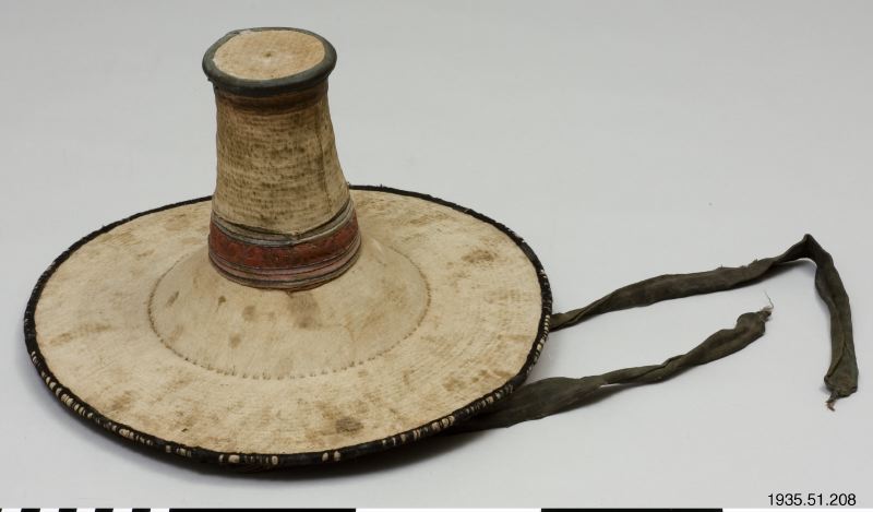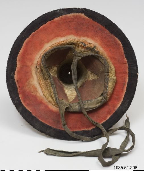 Peaked hat. /generalkatalogen. Hatt med breda brätten och med stomme av flätverk som klätts med oblekt bomullstyg på utsidan och rött på insidan. Hatten har en smal topp med platt ovansida, klädd med rutig spetskypert. Runt toppen sitter röda och svarta band. /EM070228