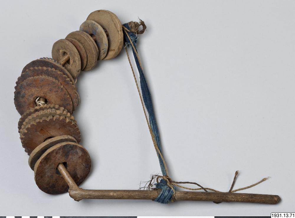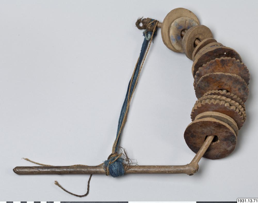 • Träskallra. Skallra med 15 stycken runda träskivor. Sex av skivorna är vågiga i kanten och den bågformiga käppen sammanhålles med både snöre och blått bomullsband.