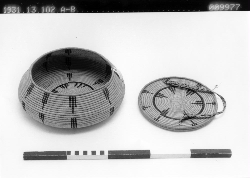 • Enligt generalkatalogen: Korg. Lock försett med långt flätat rött, gult och svart handtag. Sparsam dekor i svart och rött.