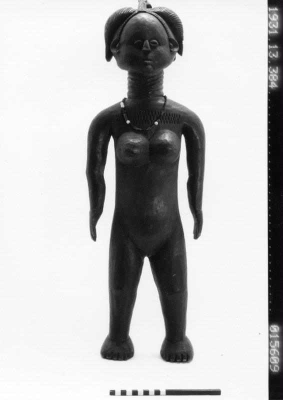 • Enligt generalkatalogen: Statyett. Av trä. Svartmålad. Bundu. Föreställande kvinnogestalt. Halsband av röda, svarta och vita glaspärlor.