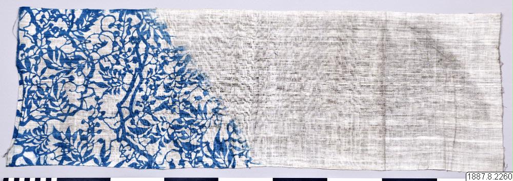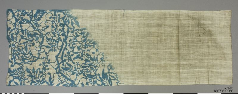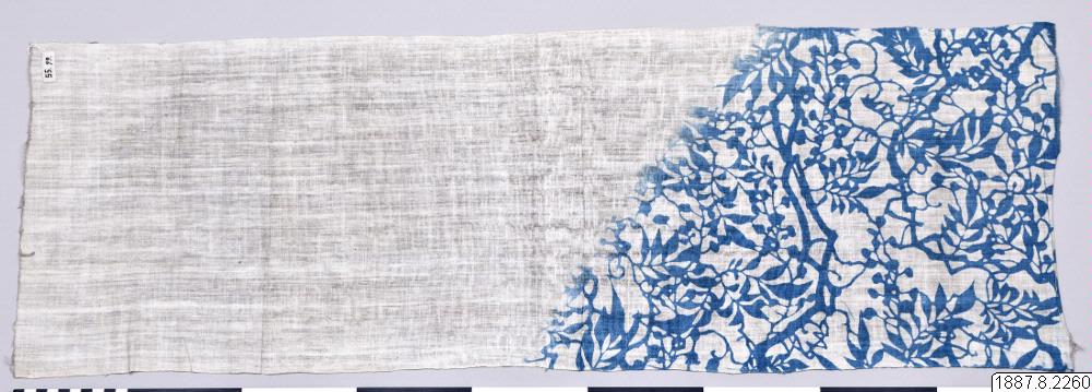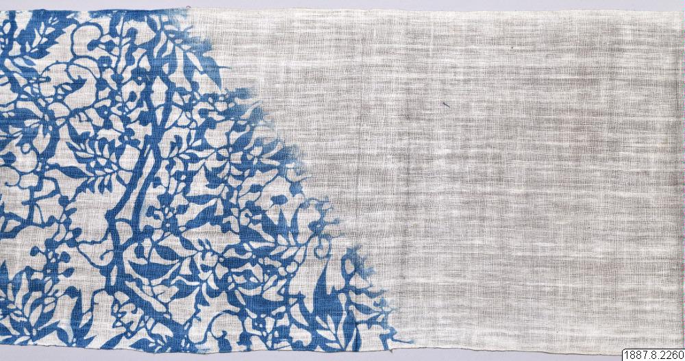 Handduk, nyttjas även av kulier till huvudbindel, för att ta upp svetten, samt gives som presenter bland det fattigare folket. Blått växtmönster i ena hörnet. Tenugui av delvis indigofärgad bomull med schablonmönstring. Tygmönstren i katazome görs med en pappersliknande schablon gjord av fibrer från pappersmullbärsträdet, impregnerad med juice från omogna persimmonfrukter. Mönstret skärs ut med e...