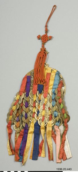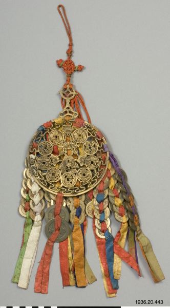 Amulett bestående av en ¿spegel¿ med skaft, sammansatt av amulettmynt och lyckobringande ornament, fjärilar etc. Vid själva spegeln fästade sidenband med uppträdda kopparmynt och amulettmynt. Troligen avsedd att hängas upp i hemmet för att bringa lycka och hålla onda andar på avstånd. /generalkatalog