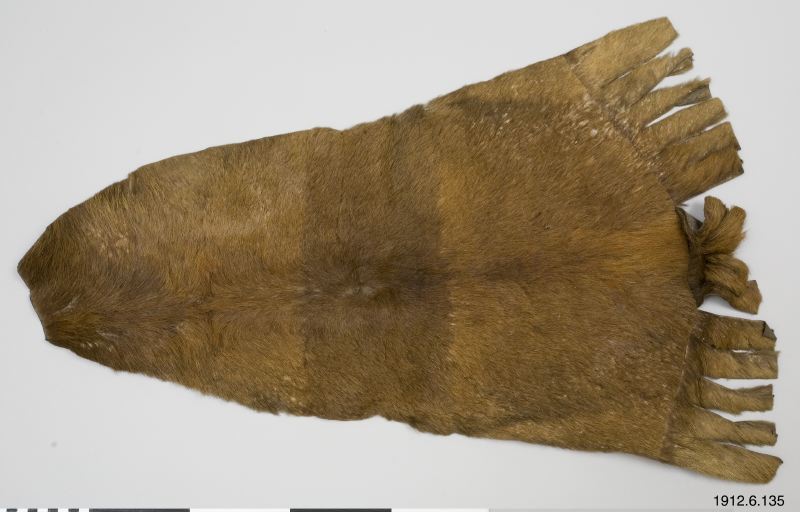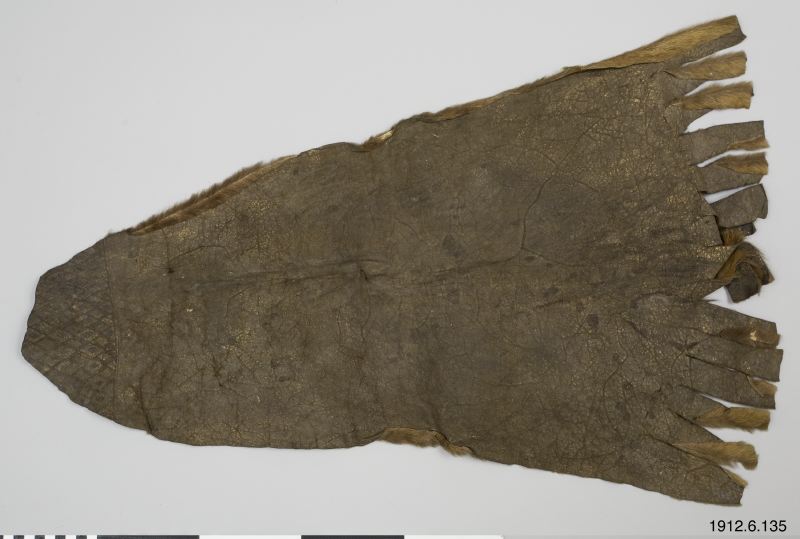 "Some, but not all men's skirts are on the hairless side provided with engraved ornaments. Usually only the part of the skirt that falls over the belt is ornate. The rest of the hairless side of the skin is facing the body and thus does not need any ornament. However, skirts with completely ornate insides occur at some point (Fig. 32). (…) Fig. C is of antelope skin, however, the species can not be determined. The colour is reddish brown. The lower part of the skirt is cut out in rectangular flaps. Immediately above these flaps, the hair on the skin is cut off in a sharply defined line, extending in an arc from one side of the skin to the other. Below this line, the hair is thinned, giving the tabs a lighter colour. This gives the skirt the appearance of being adorned with a fringe, made of another piece of leather. The upper part of the hairless side is provided with an engraved ornament similar to that found in Fig. 32. The skirt is 77 cm. far." (pp. 134 - 138, von Rosen, 1916, translated from Swedish).