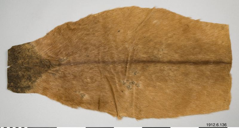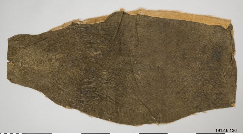"Some, but not all men's skirts are on the hairless side provided with engraved ornaments. Usually only the part of the skirt that falls over the belt is ornate. The rest of the hairless side of the skin is facing the body and thus does not need any ornament. However, skirts with completely ornate insides occur at some point (Fig. 32). (…) The skin in Fig. 32 is reddish brown and probably from the same kind of antelope as the skirt on pl. 39: Fig. C. The hairless side is, it seems, covered with engraved ornaments, the appearance of which is evident from the detail in Fig. 33. The length of the skirt is 82 cm. For the way in which the pattern is applied, I will explain in my description of the batwa women's coats." (pp. 134 - 138, von Rosen, 1916, translated from Swedish).
