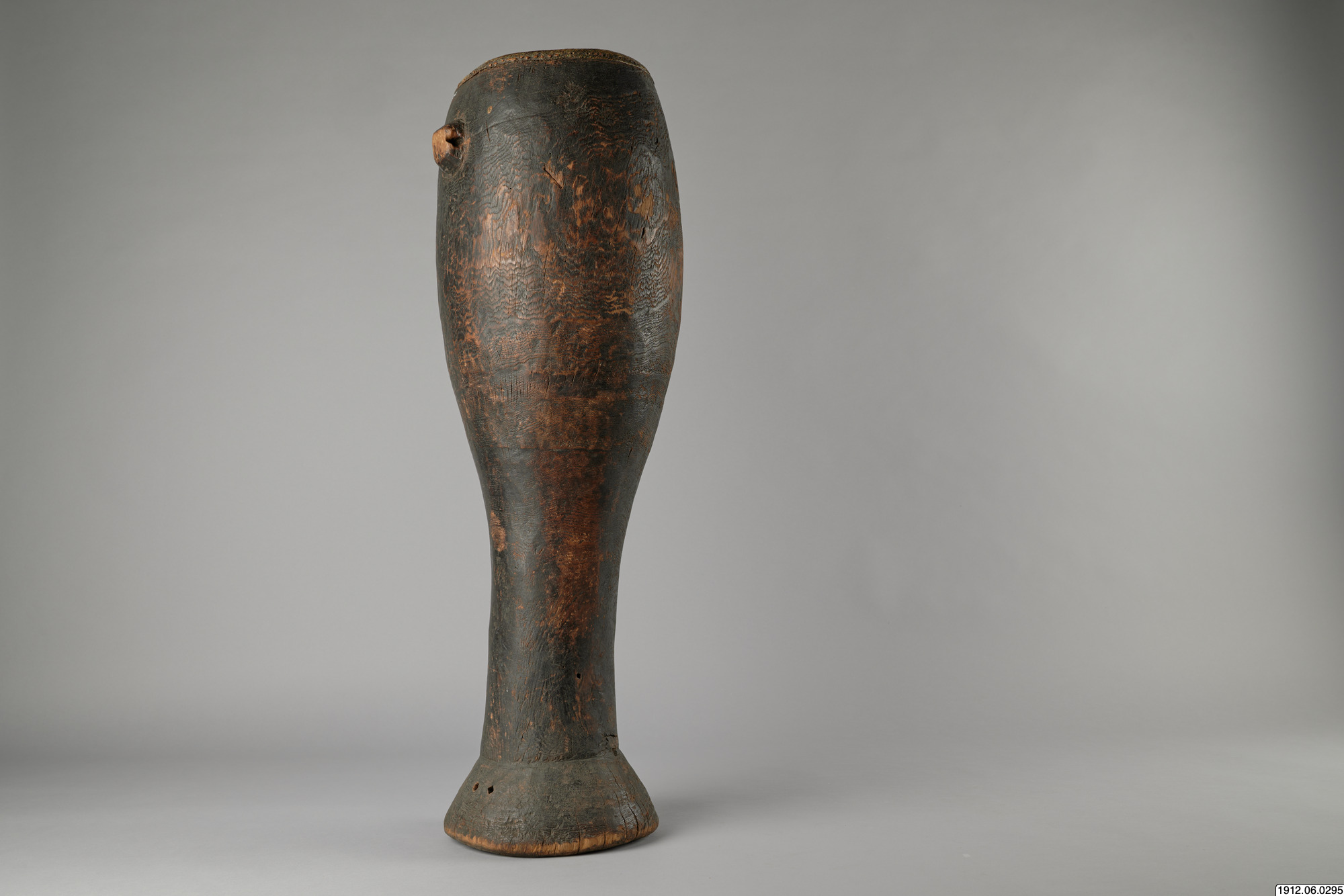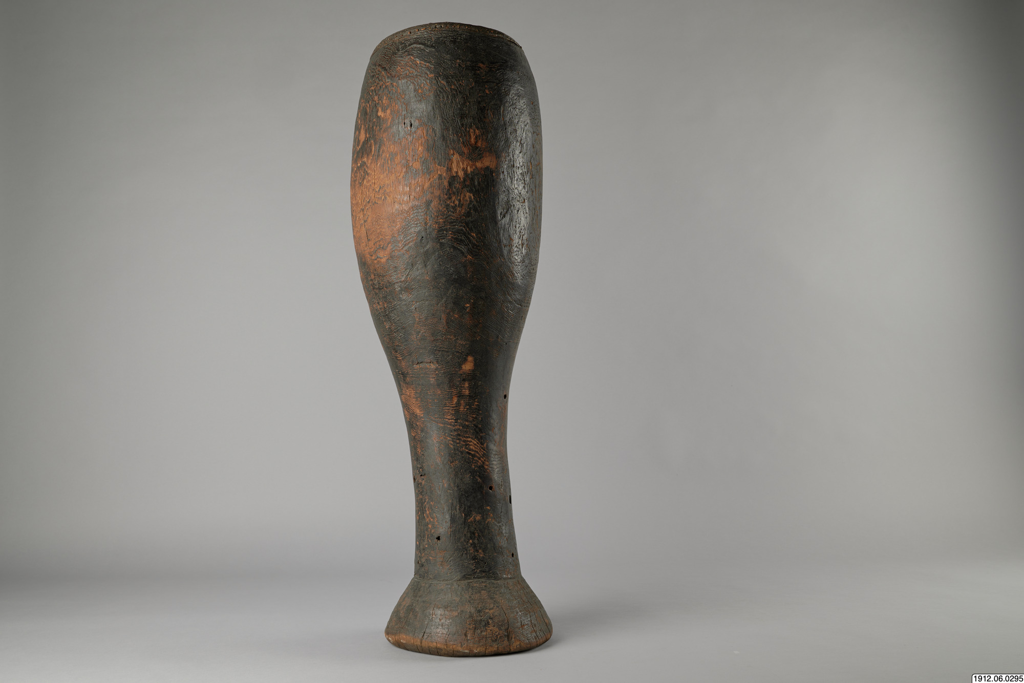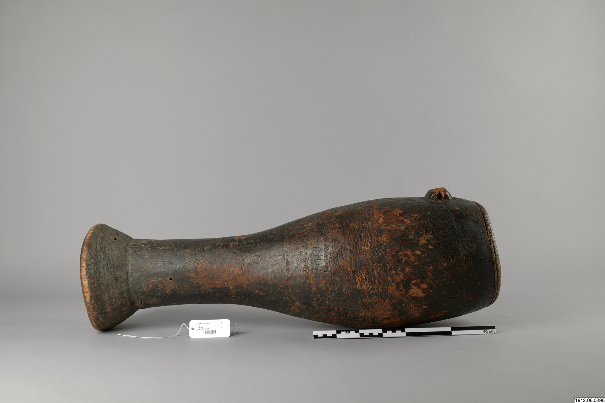 "Batwa use both small and large drums. I want to start by describing the larger battle and then choose as a type example the large batwat drum (hg. 169) in my collection, which has been left to the National Museum. This drum, like most drums in Central Africa, consists of a tubular hollowed-out wooden log, over one of whose mouths a Varanus skin has been stretched. The cross section of the drumstick is approximately circular; at the top it has a slightly more oval shape. The lower half of the log is cylindrical and rests on one foot in the form of an inverted truncated cone with a slightly outwardly curved side. The cylindrical part of the drumstick has a diameter of 15.5 cm. and the foot diameter is 25 cm. Upwards, the drumstick swells out to a width of 30 cm, but tapers slightly again towards the mouth. This is of oval shape and measures 27 cm. in length and 23 cm. in width. Fig. 170 shows the longitudinal section of this drum. The hollow is so skilfully made that of the original wooden log only a shell of 3—3.5 cm thick remains. I have previously pointed out that the swamp people, when they erode canoes, do not use fire for this purpose, as they consider that the wood in a canoe that is burnt out is easily exposed to cracking. In the manufacture of drumsticks, however, batwa use fire to facilitate the work; a crack in a drum log means little, as a crack in a canoe makes it virtually incapable. In addition, since the drumstick is made in one piece and is not joined by two hollowed-out halves of a longitudinally split log, the work of eroding the drumstick would take an unreasonably long time, unless the fire was used. The outside of the drumstick is also treated with fire (scorch), so that the wood becomes resistant to rot. A wooden button has been cut out near the upper mouth of the drumstick. Through this button a hole is arranged in the horizontal direction, in the manner shown in Fig. 169. On the foot vertically below the button, two holes are drilled next to each other. A carrying strap has been fastened with one end in the button, the other end has been threaded through the holes in the foot and tied there." (pp. 258-259, von Rosen, 1916, translated from Swedish).