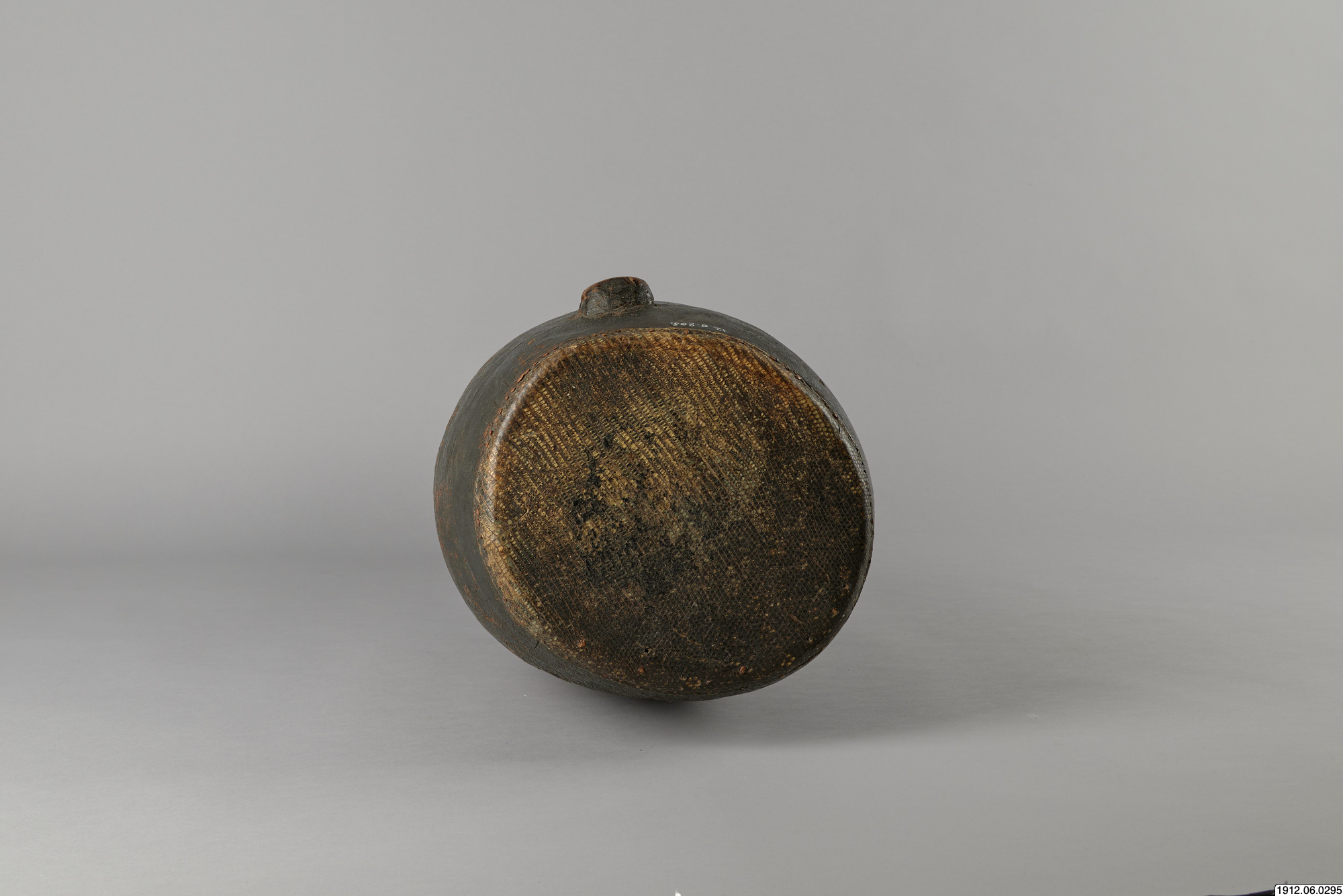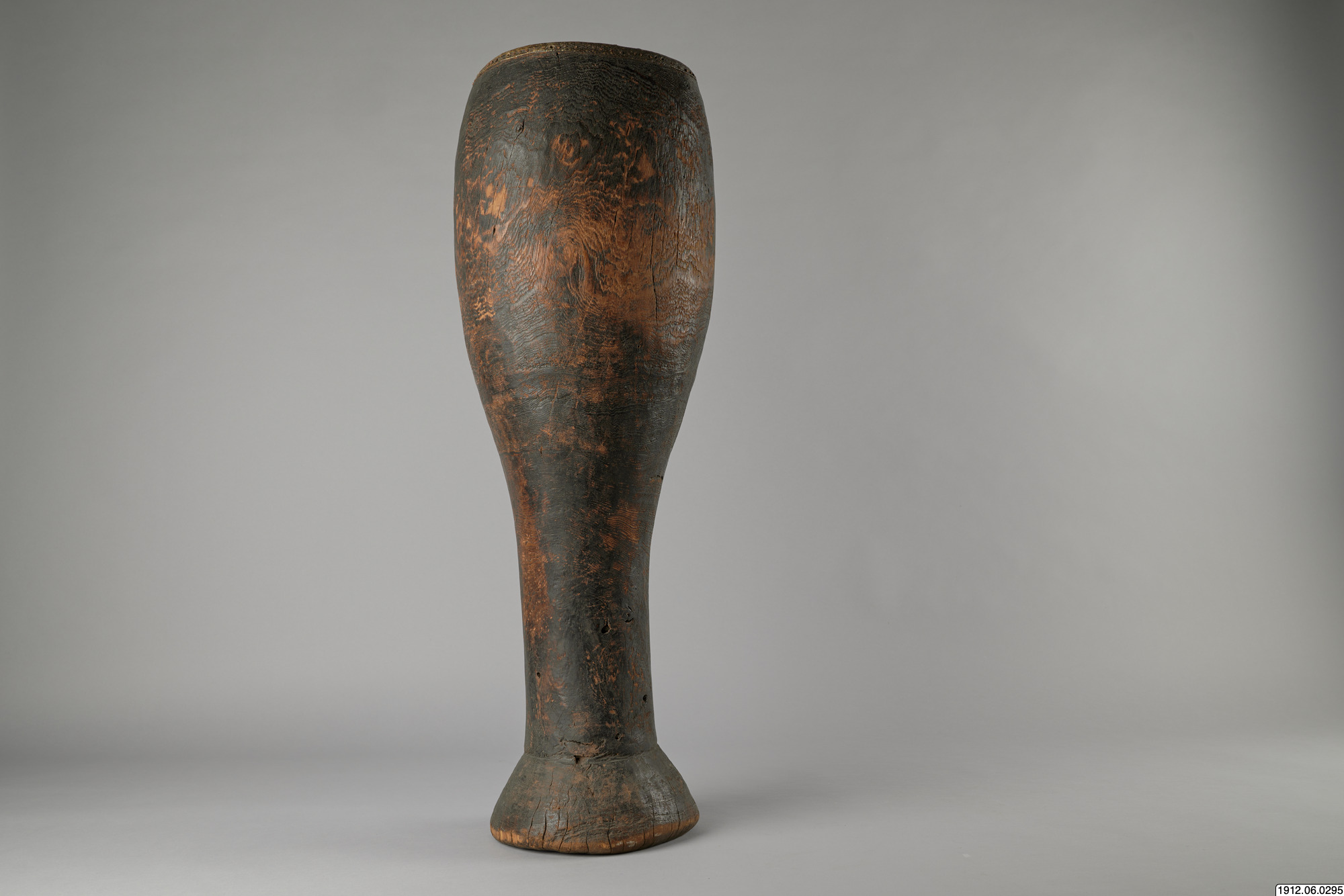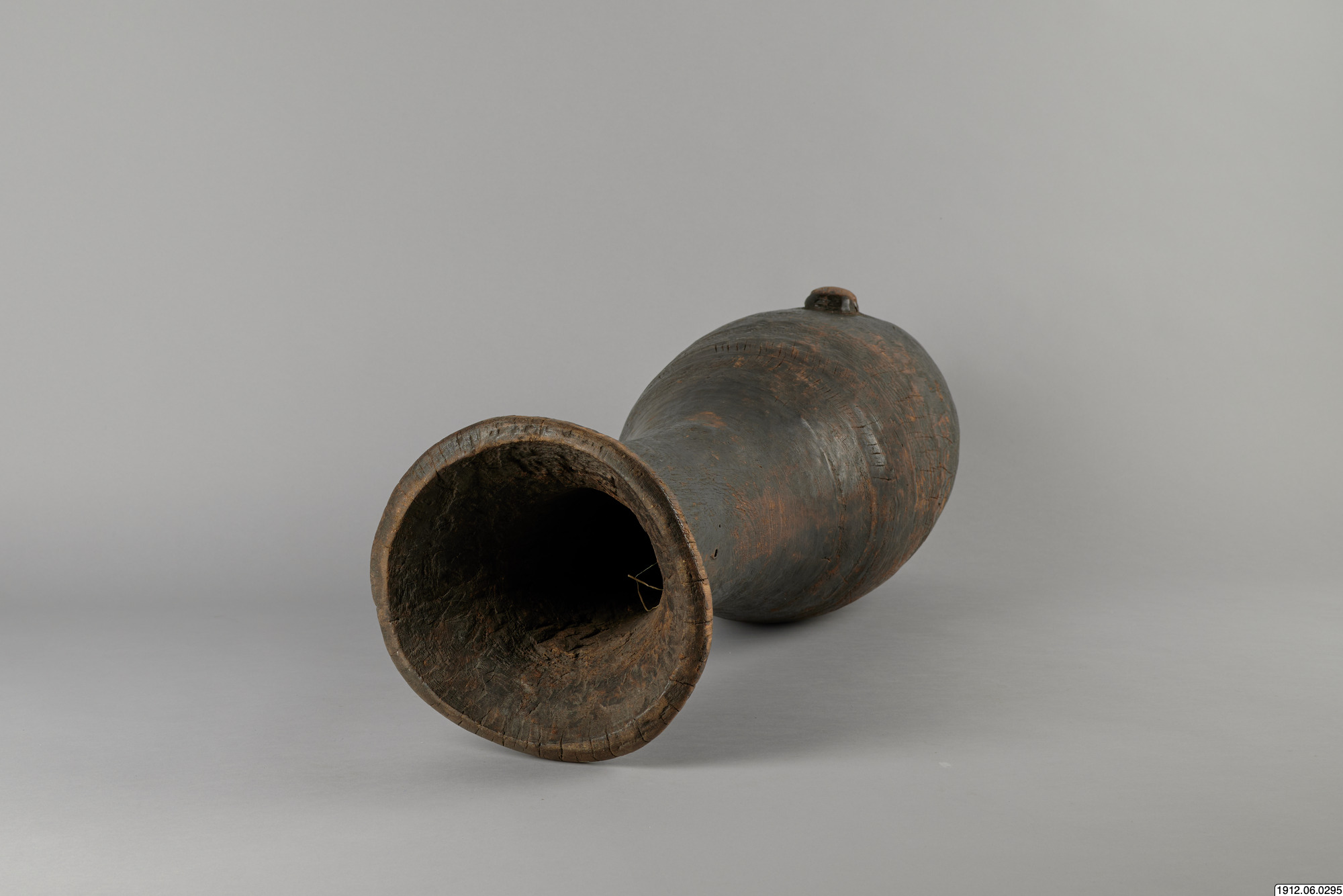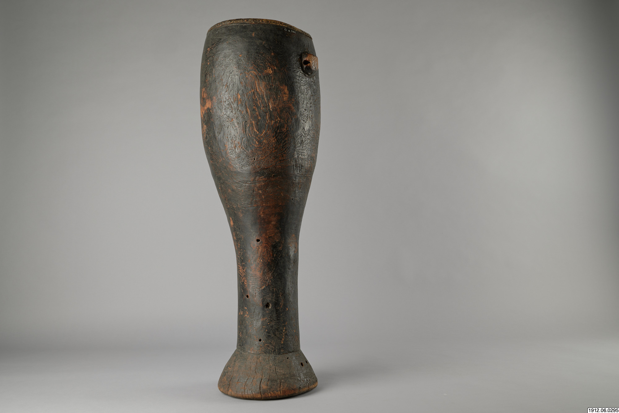 "Batwa use both small and large drums. I want to start by describing the larger battle and then choose as a type example the large batwat drum (hg. 169) in my collection, which has been left to the National Museum. This drum, like most drums in Central Africa, consists of a tubular hollowed-out wooden log, over one of whose mouths a Varanus skin has been stretched. The cross section of the drumstick is approximately circular; at the top it has a slightly more oval shape. The lower half of the log is cylindrical and rests on one foot in the form of an inverted truncated cone with a slightly outwardly curved side. The cylindrical part of the drumstick has a diameter of 15.5 cm. and the foot diameter is 25 cm. Upwards, the drumstick swells out to a width of 30 cm, but tapers slightly again towards the mouth. This is of oval shape and measures 27 cm. in length and 23 cm. in width. Fig. 170 shows the longitudinal section of this drum. The hollow is so skilfully made that of the original wooden log only a shell of 3—3.5 cm thick remains. I have previously pointed out that the swamp people, when they erode canoes, do not use fire for this purpose, as they consider that the wood in a canoe that is burnt out is easily exposed to cracking. In the manufacture of drumsticks, however, batwa use fire to facilitate the work; a crack in a drum log means little, as a crack in a canoe makes it virtually incapable. In addition, since the drumstick is made in one piece and is not joined by two hollowed-out halves of a longitudinally split log, the work of eroding the drumstick would take an unreasonably long time, unless the fire was used. The outside of the drumstick is also treated with fire (scorch), so that the wood becomes resistant to rot. A wooden button has been cut out near the upper mouth of the drumstick. Through this button a hole is arranged in the horizontal direction, in the manner shown in Fig. 169. On the foot vertically below the button, two holes are drilled next to each other. A carrying strap has been fastened with one end in the button, the other end has been threaded through the holes in the foot and tied there." (pp. 258-259, von Rosen, 1916, translated from Swedish).