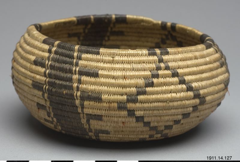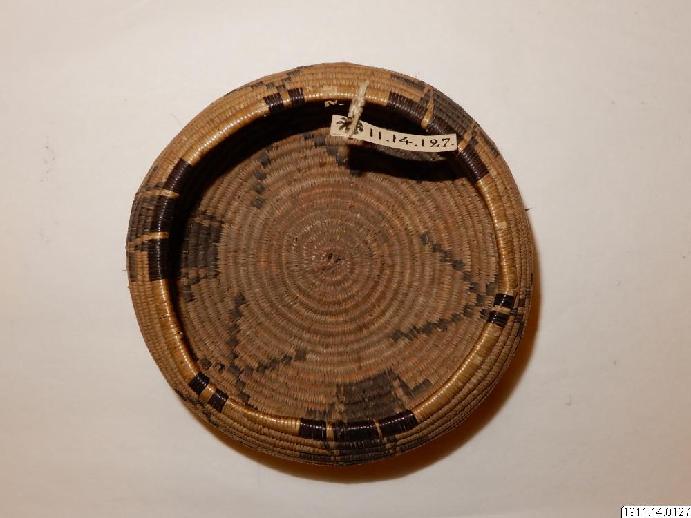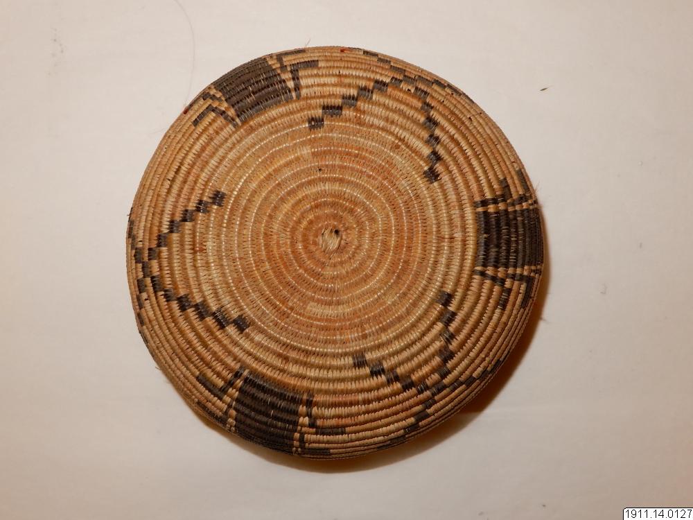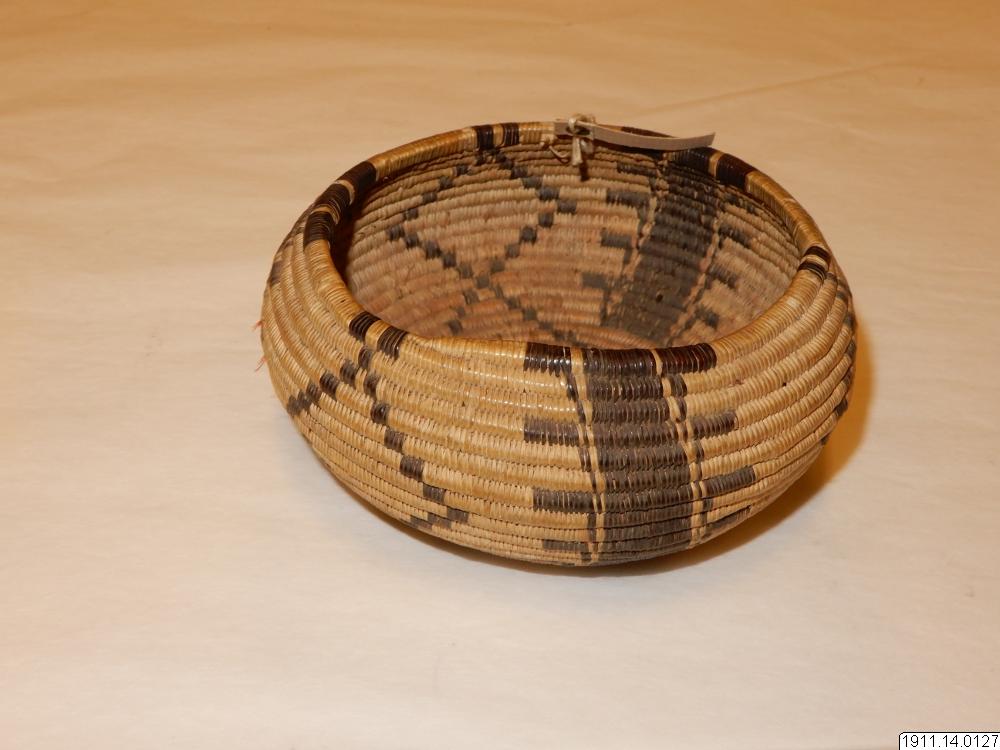 Korg. Liten, tät, spiralformigt uppbyggd, rundade sidor, liten plan-konkav botten. Stor öppning. Svart dekor bestående av tre lika, rektangulära mönster med parvis utgående ben och tre rombiska mönster i samma färg. För förvaring av kvinnornas nipper. (generalkatalog)