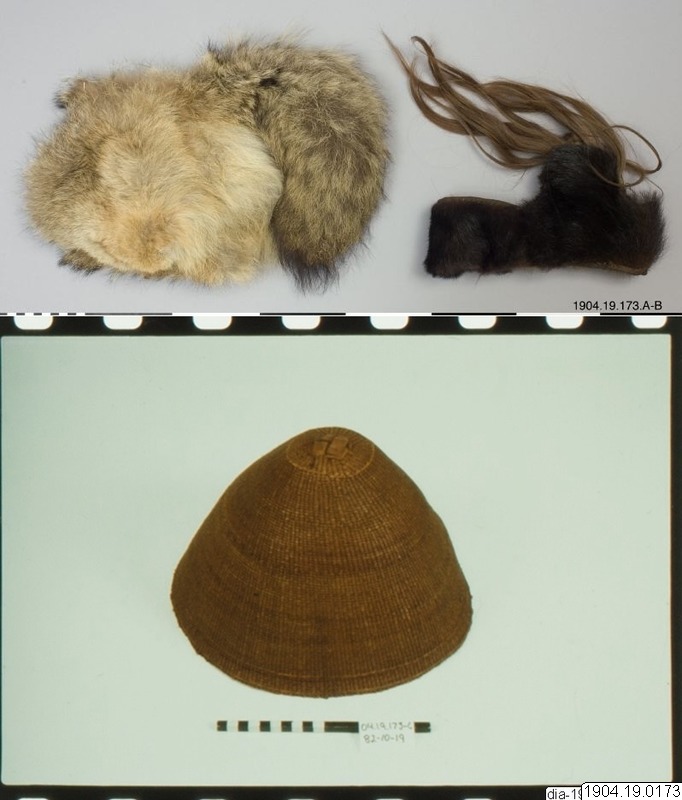 Tre huvudbonader: a) luva, vargskinnb) huvudbonad, björnskinnc) hatt, cederbast