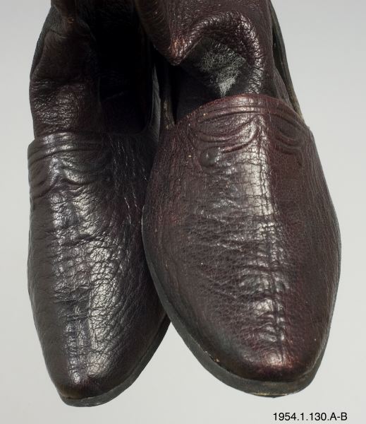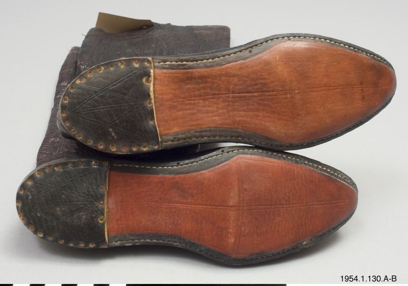 • Ett par svarta stövlar med galoschskor, vilka är avtagbara. Röd undersida.
