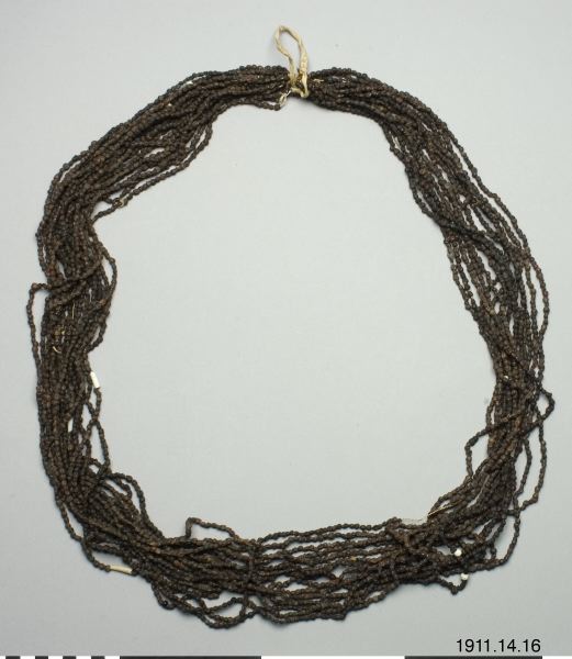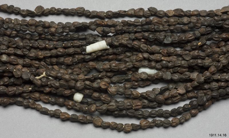 Strängar av små kantiga, mörkbruna frön hopbundna med tunt skinnband; några snäckskalsoch vita och blå glaspärlor ha utan synbar ordning tillfogats. Enligt originalkatalogen "Eepe berries (dried juniper berries)?. [ocr]