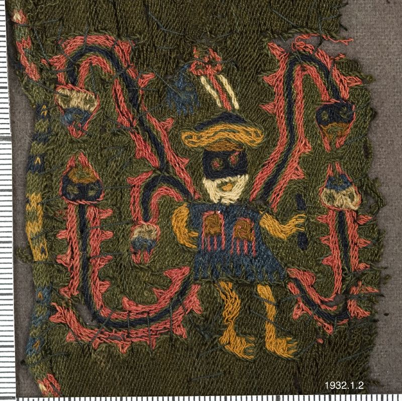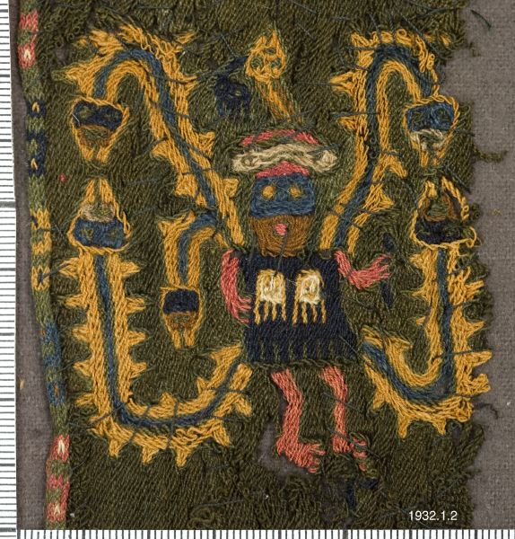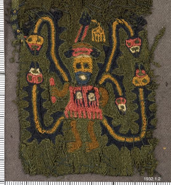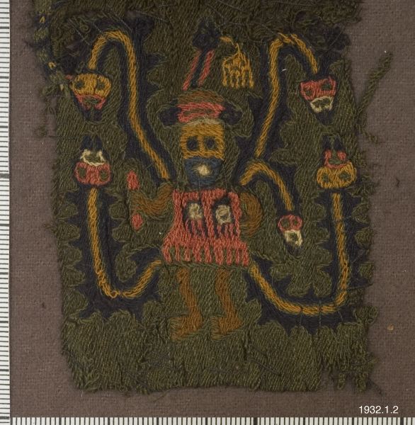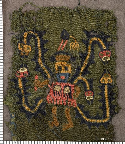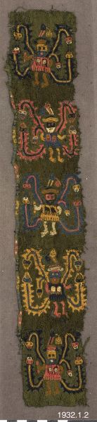 med taggiga utskott (den mexikanska fjäderormen?), de förra med nedåtböjda, de senare med uppåtböjda huvud. Möjligt är att dessa djurfigurer skola föreställa tusenfotingar. Från ena axeln, omväxlande den: vänstra och den högra, utgår även en kortare med huvud försedd djurkropp. Varannan figur har fötterna ställda åt höger varannan åt vänster. Såväl människofigurerna-troligen mytologiska figurer ~ som djurkropparna äro framställda i klara och starka färger, blått, gult, grått, rött, svart och vitt. Längd: 40 cm. Bredd 7 cm, Peru Sydamerika. [ocr]