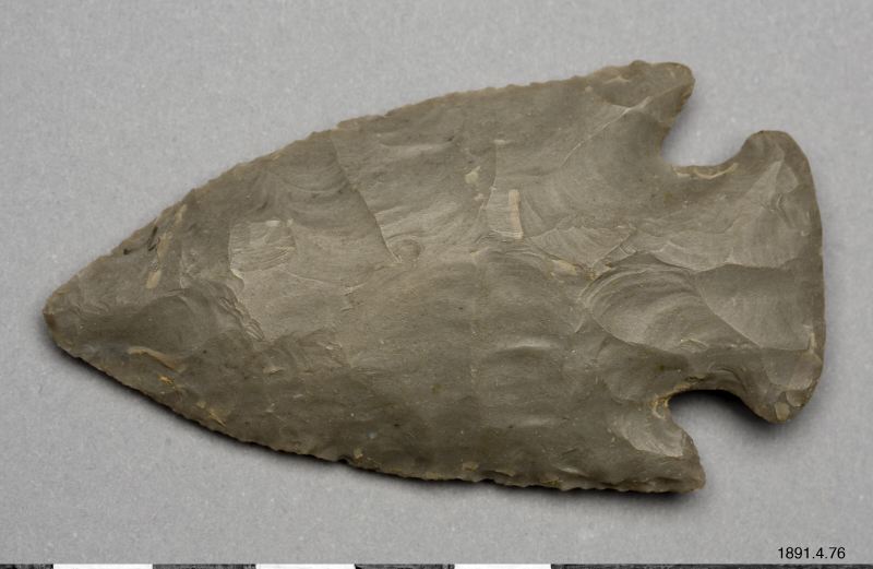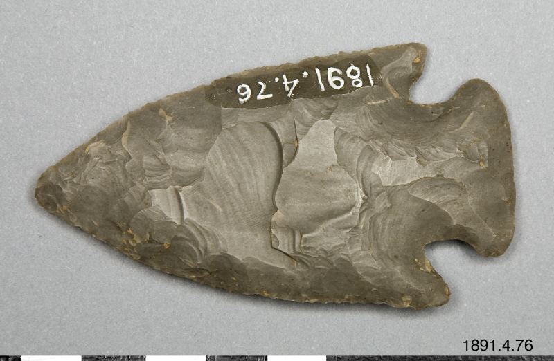 • Spjutspets med svagt konvexa sidoeggar som slutar i spetsar, den ena skadad. Skaftdelen smalare än bladet.