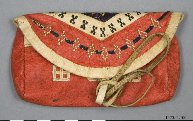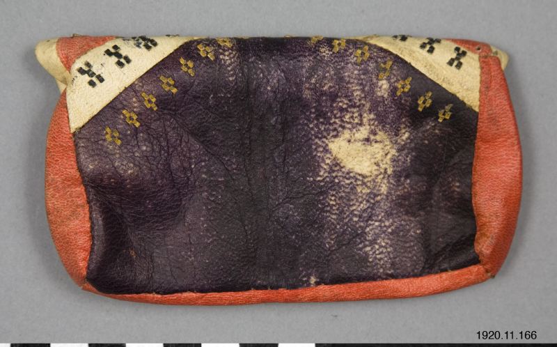 • Tobakspung av sälskinn. Rektangulär form. Nedvikt lock med läderrem varmed pungen bindes om. Framsidan av rött skinn med mosaikbroderier. Baksidan mörkt violett. (generalkatalogen)